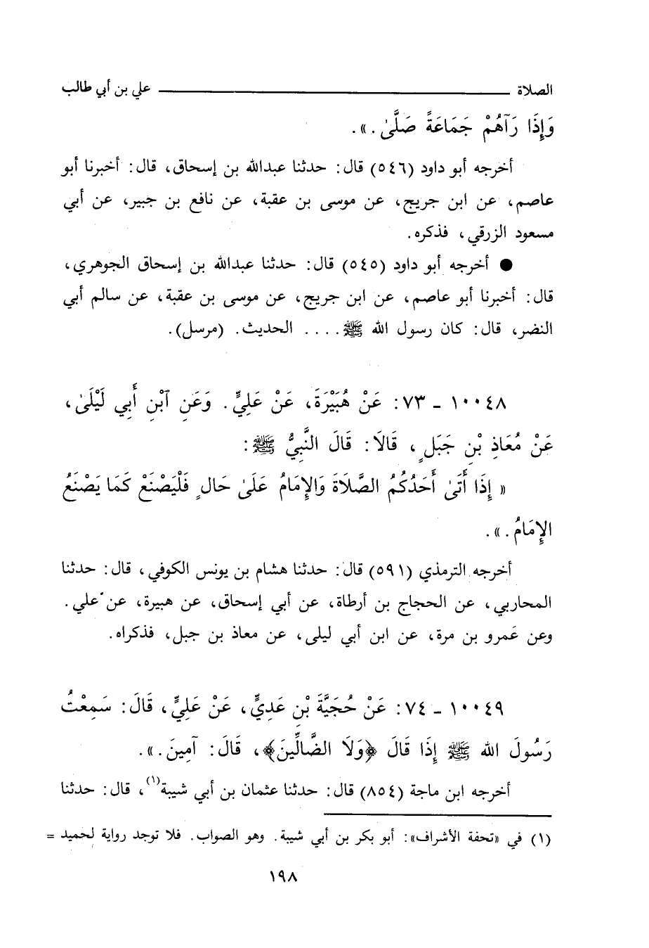 أخرجه التِّرْمِذي (٥٩١) قال: حدَّثنا هِشَام بن يُونُس الكُوفِي، حدَّثنا المُحَارِبِي، عن الحَجَّاج بن أَرْطَاة، عن أَبي إِسْحاق، عن هُبَيْرة بن يَرِيم، عن علي، وعن عَمْرو بن مُرَّة، عن ابن أَبي لَيْلَى، عن مُعَاذ بن جَبَل، فذكراه.