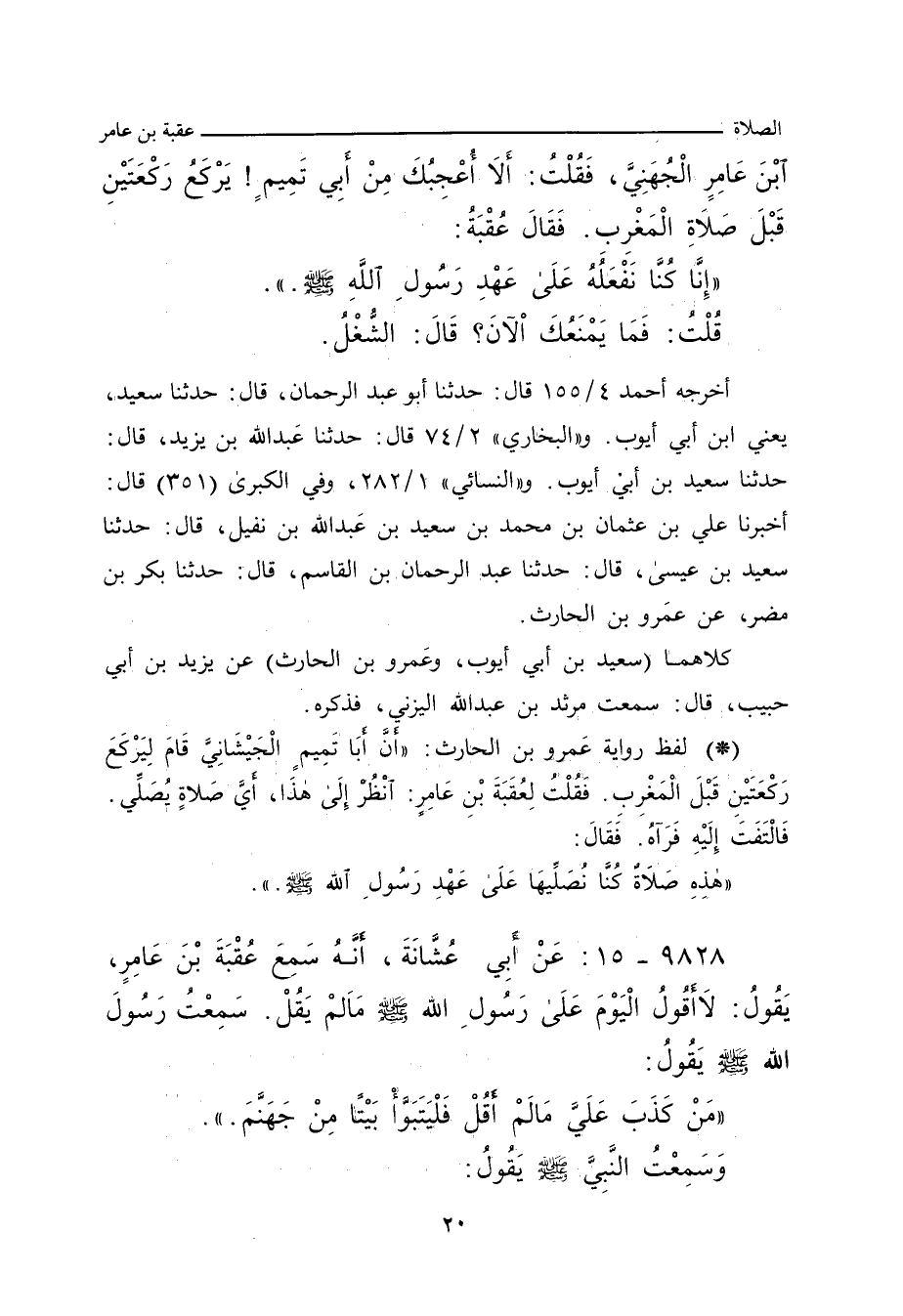 بْنَ عَامِرٍ الْجُهَنِيَّ، فَقُلْتُ لَهُ: أَلَا أُعَجِّبُكَ مِنْ أَبِي تَمِيمٍ الْجَيْشَانِيِّ يَرْكَعُ رَكْعَتَيْنِ قَبْلَ صَلَاةِ الْمَغْرِبِ، وَأَنَا أُرِيدُ أَنْ أَغْمِصَهُ. قَالَ عُقْبَةُ: