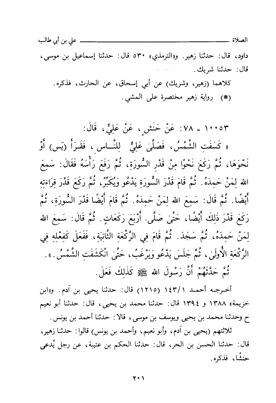 كَسَفَتِ الشَّمْسُ، فَصَلَّى عَلِيٌّ لِلنَّاسِ، فَقَرَأَ: "يس)، أَوْ نَحْوَهَا، ثُمَّ رَكَعَ نَحْوًا مِنْ قَدْرِ سُورَةٍ، ثُمَّ رَفَعَ رَأْسَهُ، فَقَالَ: سَمِعَ اللَّهُ لِمَنْ حَمِدَهُ، ثُمَّ قَامَ قَدْرَ السُّورَةِ يَدْعُو وَيُكَبِّرُ، ثُمَّ رَكَعَ قَدْرَ قِرَاءَتِهِ أَيْضًا، ثُمَّ قَالَ: سَمِعَ اللَّهُ لِمَنْ حَمِدَهُ، ثُمَّ قَامَ أَيْضًا قَدْرَ السُّورَةِ، ثُمَّ رَكَعَ قَدْرَ ذَلِكَ أَيْضًا، حَتَّى صَلَّى أَرْبَعَ رَكَعَاتٍ، ثُمَّ قَالَ: سَمِعَ اللَّهُ لِمَنْ حَمِدَهُ، ثُمَّ سَجَدَ، ثُمَّ قَامَ إِلَى الرَّكْعَةِ الثَّانِيَةِ، فَفَعَلَ كَفِعْلِهِ فِي الرَّكْعَةِ الأُولَى، ثُمَّ جَلَسَ يَدْعُو وَيَرْغَبُ، حَتَّى انْكَشَفَتِ الشَّمْسُ.