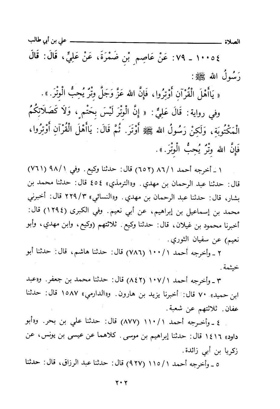 - وفي رواية: قَالَ عَلِيٌّ بْنُ أَبِي طَالِبٍ: إِنَّ الْوِتْرَ لَيْسَ بِحَتْمٍ، وَلَا كَصَلَاتِكُمُ الْمَكْتُوبَةِ، وَلَكِنْ رَسُولُ اللهِ صلى الله عليه وسلم أَوْتَرَ، ثُمَّ قَالَ: يَا أَهْلَ الْقُرْآنِ أَوْتِرُوا، فَإِنَّ اللهَ وِتْرٌ يُحِبُّ الْوِتْرَ.