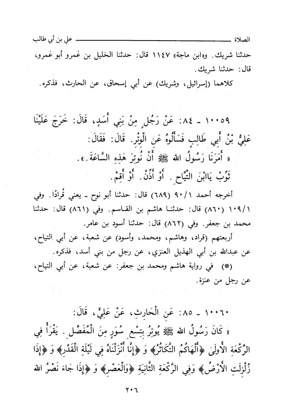 - وفي رواية: خَرَجَ عَلِيٌّ حِينَ ثَوَّبَ الْمُثَوِّبُ لِصَلَاةِ الصُّبْحِ، فَقَالَ: إِنَّ رَسُولَ اللهِ صلى الله عليه وسلم أَمَرَنَا بِوِتْرٍ، فَثَبَتَ لَهُ هَذِهِ السَّاعَةَ.