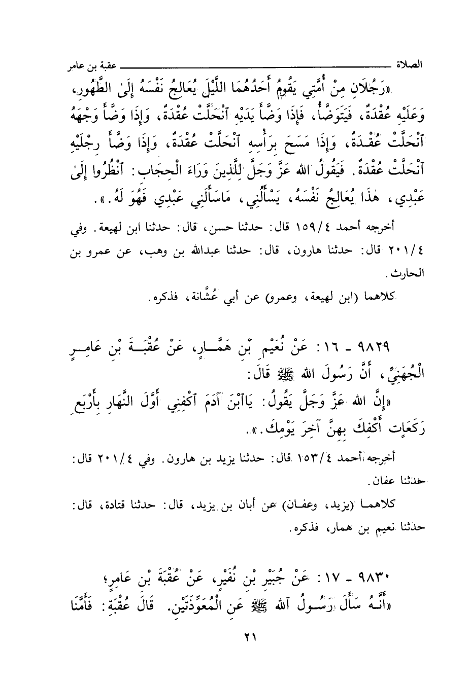٩٨٢٩ - عَنْ نُعَيْمِ بْنِ هَمَّارٍ، عَنْ عُقْبَةَ بْنِ عَامِرٍ الْجُهَنِيِّ، أَنَّ رَسُولَ اللهِ صلى الله عليه وسلم قَالَ: