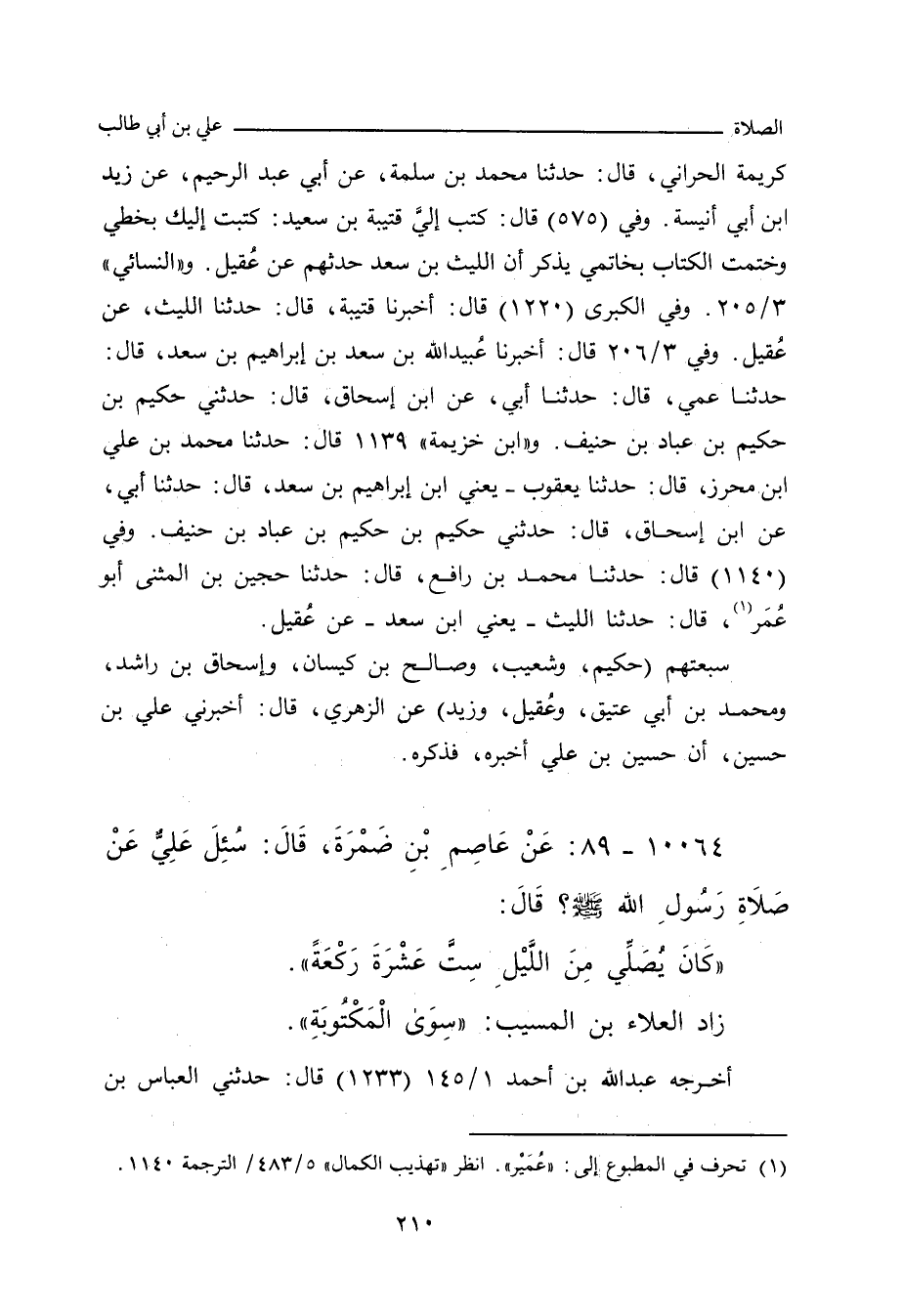 كَرِيمة الحَرَّانِي، حدَّثنا مُحَمد بن سَلَمَة، عن أَبي عَبْد الرَّحِيم، عن زَيْد بن أَبي أُنَيْسَة. وفي (٥٧٥) قال: كتب إليَّ قُتَيْبة بن سَعِيد: كتبتُ إليك بخَطِّي، وختمتُ الكتابَ بخَاتَمِي، يذكر أن اللَّيْث بن سَعْد حدَّثهم، عن عُقَيْل. و"النَّسائي" ٣/ ٢٠٥، وفي "الكبرى" ١٣١٣ و ١١٢٤٢ قال: أَخْبَرنا قُتَيْبة، قال: حدَّثنا اللَّيْث، عن عُقَيْل. وفي ٣/ ٢٠٦ قال: أَخْبَرنا عُبَيْد الله بن سَعْد بن إبراهيم بن سَعْد، قال: حدَّثنا عَمِّي، قال: حدَّثنا أَبي، عن ابن إِسْحاق، قال: حدَّثني حَكِيم بن حَكِيم بن عَبَّاد بن حُنَيْف. و"ابن خزيمة" ١١٣٩ قال: حدَّثنا مُحَمد بن علي بن مُحْرِز، حدَّثنا يَعْقُوب، يعني ابن إبراهيم ابن سَعْد، حدَّثنا أَبي، عن ابن إِسْحاق