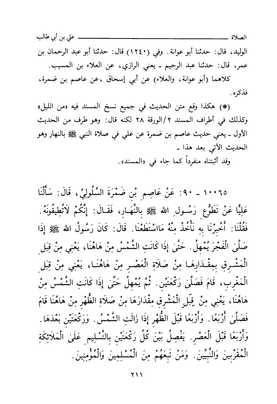 ١٠٠٦٥ - عَنْ عَاصِمِ بْنِ ضَمْرَةَ السَّلُولِيِّ، قَالَ: سَأَلْنَا عَلِيًّا عَنْ تَطَوُّعِ رَسُولِ اللهِ صلى الله عليه وسلم بالنهِارِ؟ فَقَالَ: إِنَّكُمْ لَاتُطِيقُونَهُ، فَقلْنَا: أَخْبَرنا بِهِ نَأْخُذْ مِنْهُ مَا اسْتَطَعْنَا، قَالَ: