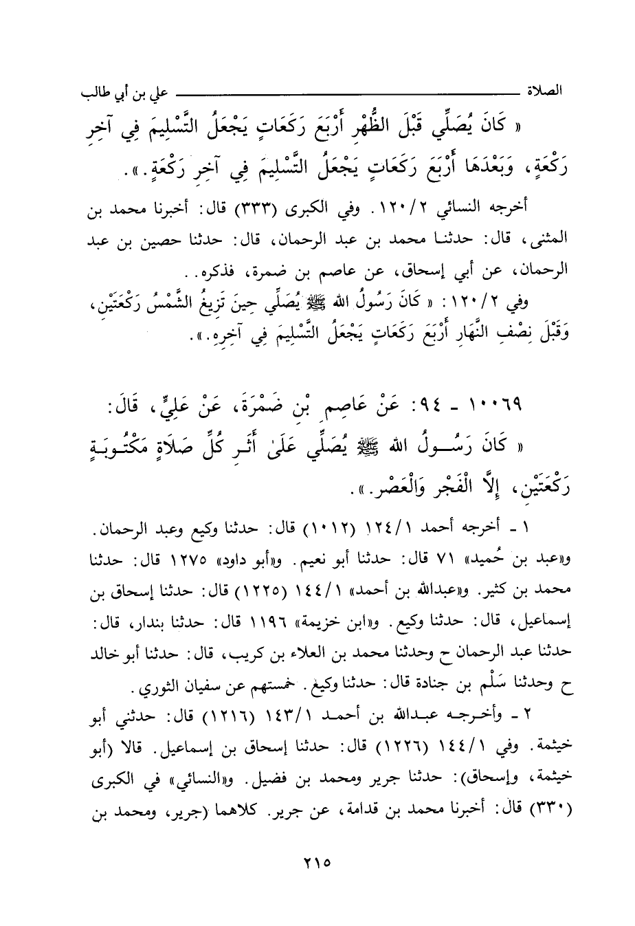 أخرجه النسائي ٢/ ١٢٠، وفي "الكبرى" ٣٣٦ و ٣٤٧ قال: أَخْبَرنا مُحَمد بن المُثَنَّى، قال: حدَّثنا مُحَمد بن عَبْد الرَّحْمان، قال: حدَّثنا حُصَيْن بن عَبْد الرَّحْمان , عن أبي إسحاق , عن عاصم بن ضمرة , فذكره.