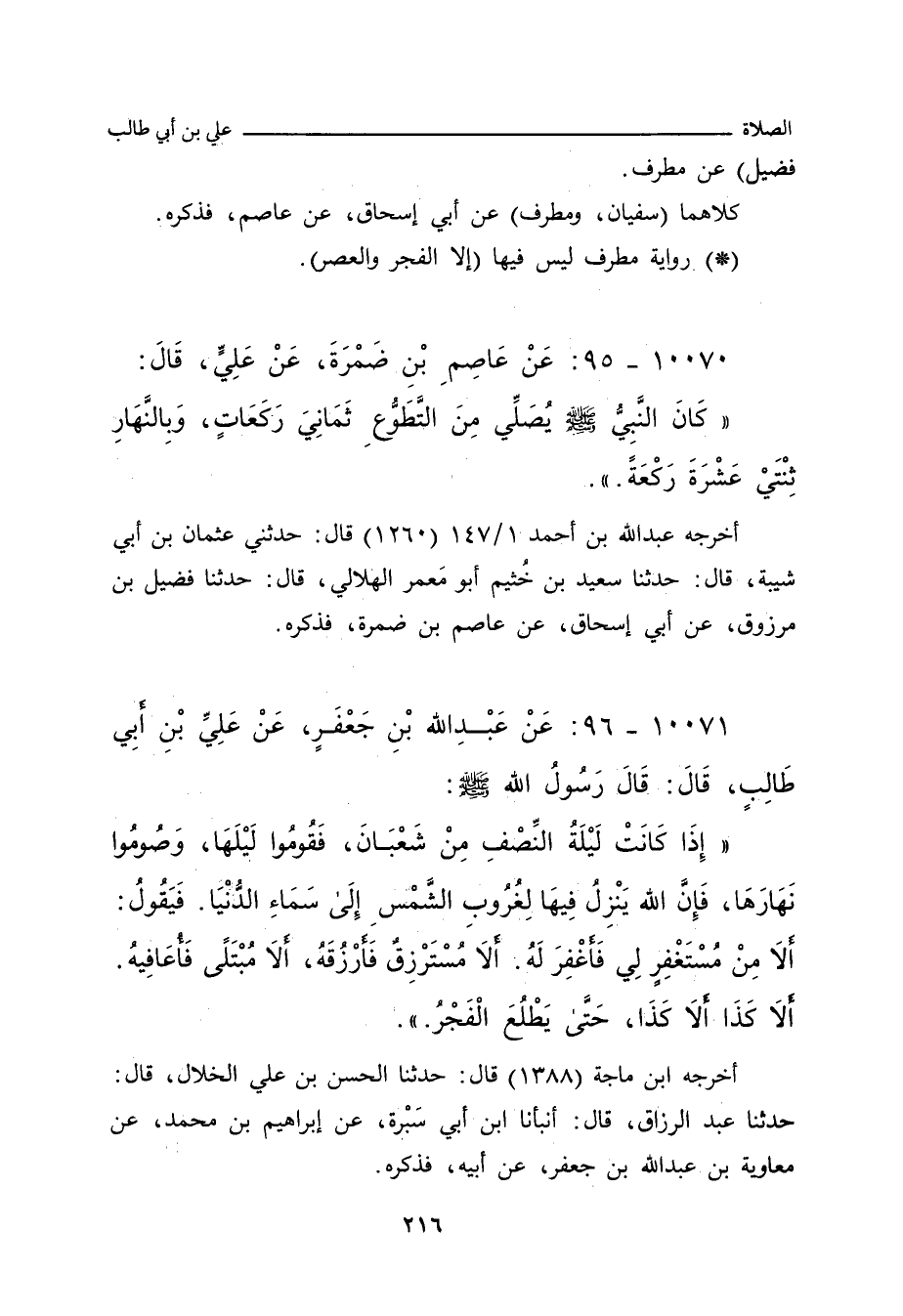 أخرجه عَبْد الله بن أحمد ١/ ١٤٧ (١٢٦١) قال: حدثني عُثْمان بن أَبي شَيْبَة، حدَّثنا سَعِيد بن خُثَيْم، أبو مَعْمَر الهِلَالِي، حدَّثنا فُضَيْل بن مَرْزُوق، عن أَبي إِسْحاق، عن عاصم بن ضَمْرَة، فذكره.
