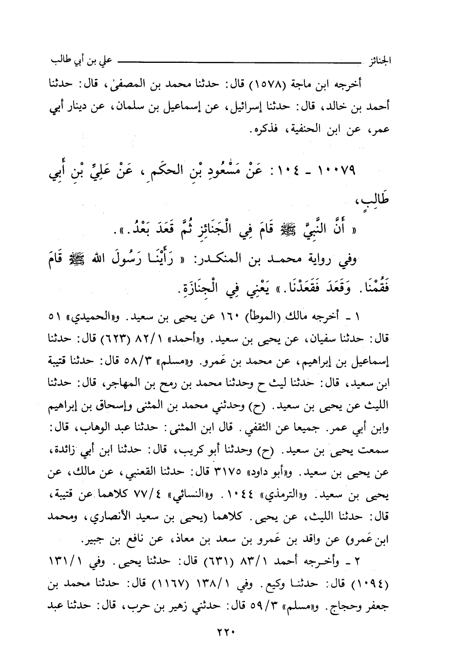 - وفي رواية: أَنَّهُ سَمِعَ عَلِيَّ بْنَ أَبِي طَالِبٍ بِرَحَبَةِ الْكُوفَةِ، وَهُوَ يَقُولُ: كَانَ رَسُولُ اللهِ صلى الله عليه وسلم أَمَرَنَا بِالْقِيَامِ فِي الْجَِنَازَةِ، ثُمَّ جَلَسَ بَعْدَ ذَلِكَ، وَأَمَرَنَا بِالْجُلُوسِ.