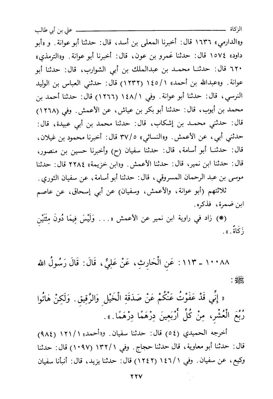 و"الدارِمِي" ١٦٢٩ قال: أَخْبَرنا المُعَلَّى ابن أَسَد، حدَّثنا أبو عَوَانَة. و"أبو داود" ١٥٧٤ قال: حدَّثنا عَمْرو بن عَوْن، أَخْبَرنا أبو عَوَانَة. و"التِّرمِذي" ٦٢٠ قال: حدَّثنا مُحَمد بن عَبْد الملك بن أَبي الشَّوَارِب، حدَّثنا أبو عَوَانَة. و (عبد الله بن أحمد) ١/ ١٤٥ (١٢٣٣) قال: حدَّثني العَبَّاس بن الوَلِيد النَّرْسِي، حدَّثنا أبو عَوَانَة. وفي ١/ ١٤٨ (١٢٦٧) قال: حدَّثنا أحمد بن مُحَمد بن أَيُّوب، حدَّثنا أبو بَكْر بن عَيَّاش، عن الأَعْمَش. وفي (١٢٦٩) قال: حدَّثني مُحَمد بن إِشْكَاب، حدَّثنا مُحَمد بن أَبي عُبَيْدة، حدَّثني أَبي، عن الأَعْمَش. و"النَّسائي" ٥/ ٣٧، وفي "الكبرى" ٢٢٦٨ قال: أَخْبَرنا محمود بن غَيْلَان، قال: حدَّثنا أبو أُسَامة، قال: حدَّثنا سُفْيان. وفي ٥/ ٣٧، وفي "الكبرى" ٢٢٦٩ قال: أَخْبَرنا حُسَين بن مَنْصُور، قال: حدَّثنا ابن نُمَيْر، قال: حدَّثنا الأَعْمَش. و"ابن خزيمة" ٢٢٦٢ و ٢٢٩٧ قال: حدَّثنا علي بن حُجْر السَّعْدِي، حدَّثنا أَيُّوب بن جابر. وفي (٢٢٨٤) قال: حدَّثنا مُوسَى بن عَبْد الرَّحْمان المَسْرُوقِي، حدَّثنا أبو أُسَامة، عن سُفْيان الثَّوْرِي.