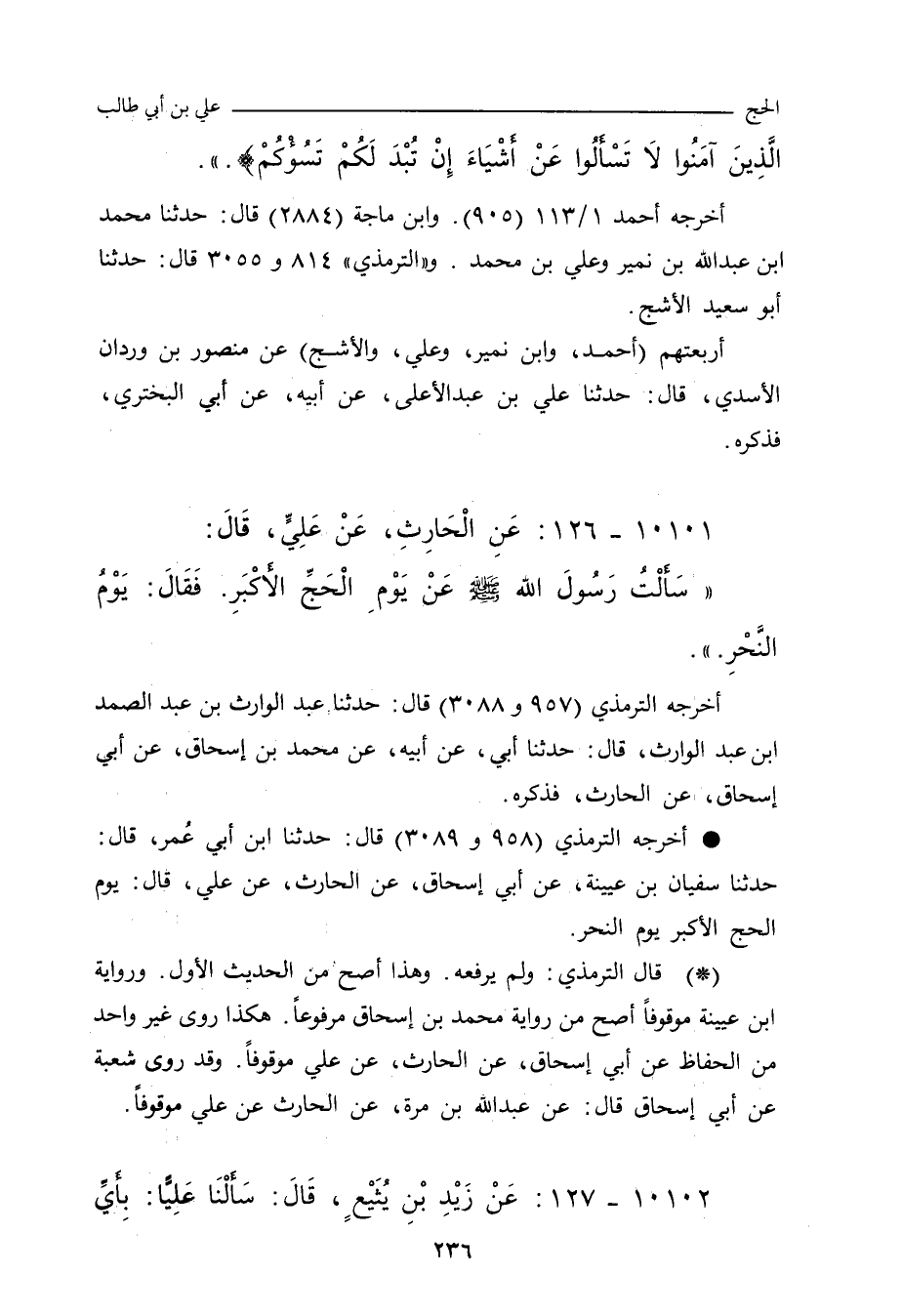 - أخرجه التِّرْمِذي (٩٥٨ و ٣٠٨٩) قال: حدَّثنا ابن أَبي عُمَر، حدَّثنا سُفْيان بن عُيَيْنَة، عن أَبي إِسْحاق، عن الحارث، عن عليٍّ، قال: يوم الحج الأَكبر، يوم النحر.