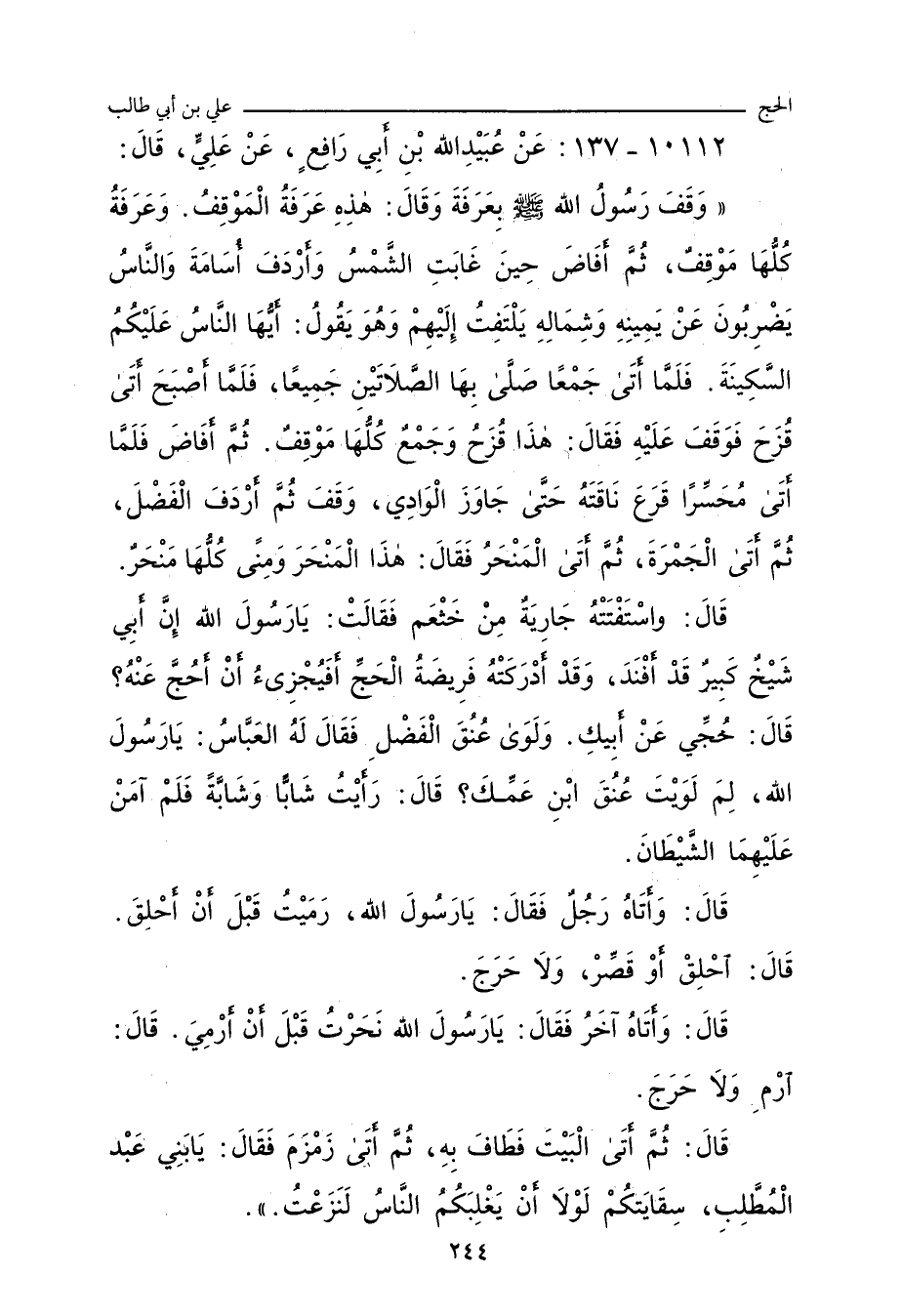 وَقَفَ رَسُولُ اللهِ صلى الله عليه وسلم بِعَرَفَةَ، فَقَالَ: هَذِهِ عَرَفَةُ، وَهَذَا هُوَ الْمَوْقِفُ، وَعَرَفَةُ كُلُّهَا مَوْقِفٌ، ثُمَّ أَفَاضَ حِينَ غَرَبَتِ الشَّمْسُ، وَأَرْدَفَ أُسَامَةَ بْنَ زَيْدٍ، وَجَعَلَ يُشِيرُ بِيَدِهِ عَلَى هِينَتِهِ، وَالنَّاسُ يَضْرِبُونَ يَمِينًا وَشِمَالاً، يَلْتَفِتُ إِلَيْهِمْ وَيَقُولُ: يَا أَيُّهَا النَّاسُ، عَلَيْكُمُ السَّكِينَةَ، ثُمَّ أَتَى جَمْعًا فَصَلَّى بِهِمُ الصَّلَاتَيْنِ جَمِيعًا، فَلَمَّا أَصْبَحَ أَتَى قُزَحَ فَوَقَفَ عَلَيْهِ، وَقَالَ: هَذَا قُزَحُ، وَهُوَ الْمَوْقِفُ، وَجَمْعٌ كُلُّهَا مَوْقِفٌ، ثُمَّ أَفَاضَ حَتَّى انْتَهَى إِلَى وَادِي مُحَسِّرٍ، فَقَرَعَ نَاقَتَهُ، فَخَبَّتْ حَتَّى جَاوَزَ الْوَادِيَ، فَوَقَفَ وَأَرْدَفَ الْفَضْلَ، ثُمَّ أَتَى الْجَمْرَةَ فَرَمَاهَا، ثُمَّ أَتَى الْمَنْحَرَ، فَقَالَ: هَذَا الْمَنْحَرُ، وَمِنًى كُلُّهَا مَنْحَرٌ، وَاسْتَفْتَتْهُ جَارِيَةٌ شَابَّةٌ مِنْ خَثْعَمٍ، فَقَالَتْ: إِنَّ أَبِي شَيْخٌ كَبِيرٌ، قَدْ أَدْرَكَتْهُ فَرِيضَةُ اللهِ فِي الْحَجِّ، أَفَيُجْزِئُ أَنْ أَحُجَّ عَنْهُ؟ قَالَ: حُجِّي عَنْ أَبِيكِ، قَالَ: وَلَوَى عُنُقَ الْفَضْلِ، فَقَالَ الْعَبَّاسُ: يَا رَسُولَ اللهِ، لِمَ لَوَيْتَ عُنُقَ ابْنِ عَمِّكَ؟ قَالَ: رَأَيْتُ شَابًّا وَشَابَّةً، فَلَمْ آمَنِ الشَّيْطَانَ عَلَيْهِمَا، ثُمَّ أَتَاهُ رَجُلٌ، فَقَالَ: يَا رَسُولَ اللهِ، إِنِّي أَفَضْتُ قَبْلَ أَنْ أَحْلِقَ، قَالَ: احْلِقْ، أَوْ قَصِّرْ، وَلَا حَرَجَ، قَالَ: وَجَاءَ آخَرُ، فَقَالَ: يَا رَسُولَ اللهِ، إِنِّي ذَبَحْتُ قَبْلَ أَنْ أَرْمِيَ، قَالَ: ارْمِ