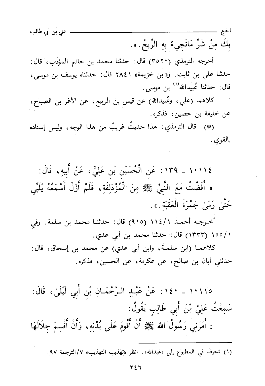- وفي رواية: عَنْ عِكْرِمَةَ، قَالَ: وَقَفْتُ مَعَ الْحُسَيْنِ، فَلَمْ أَزَلْ أَسْمَعُهُ يَقُولُ: لَبَّيْكَ لَبَّيْكَ، حَتَّى رَمَى الْجَمْرَةَ، فَقُلْتُ: يَا أَبَا عَبْدِ اللهِ، مَا هَذَا الإِهْلَالُ؟ قَالَ: سَمِعْتُ عَلِيَّ بْنَ أَبِى طَالِبٍ يُهِلُّ حَتَّى انْتَهَى إِلَى الْجَمْرَةِ، وَحَدَّثَنِي أَنَّ رَسُولَ اللهِ صلى الله عليه وسلم أَهَلَّ حَتَّى انْتَهَى إِلَيْهَا.