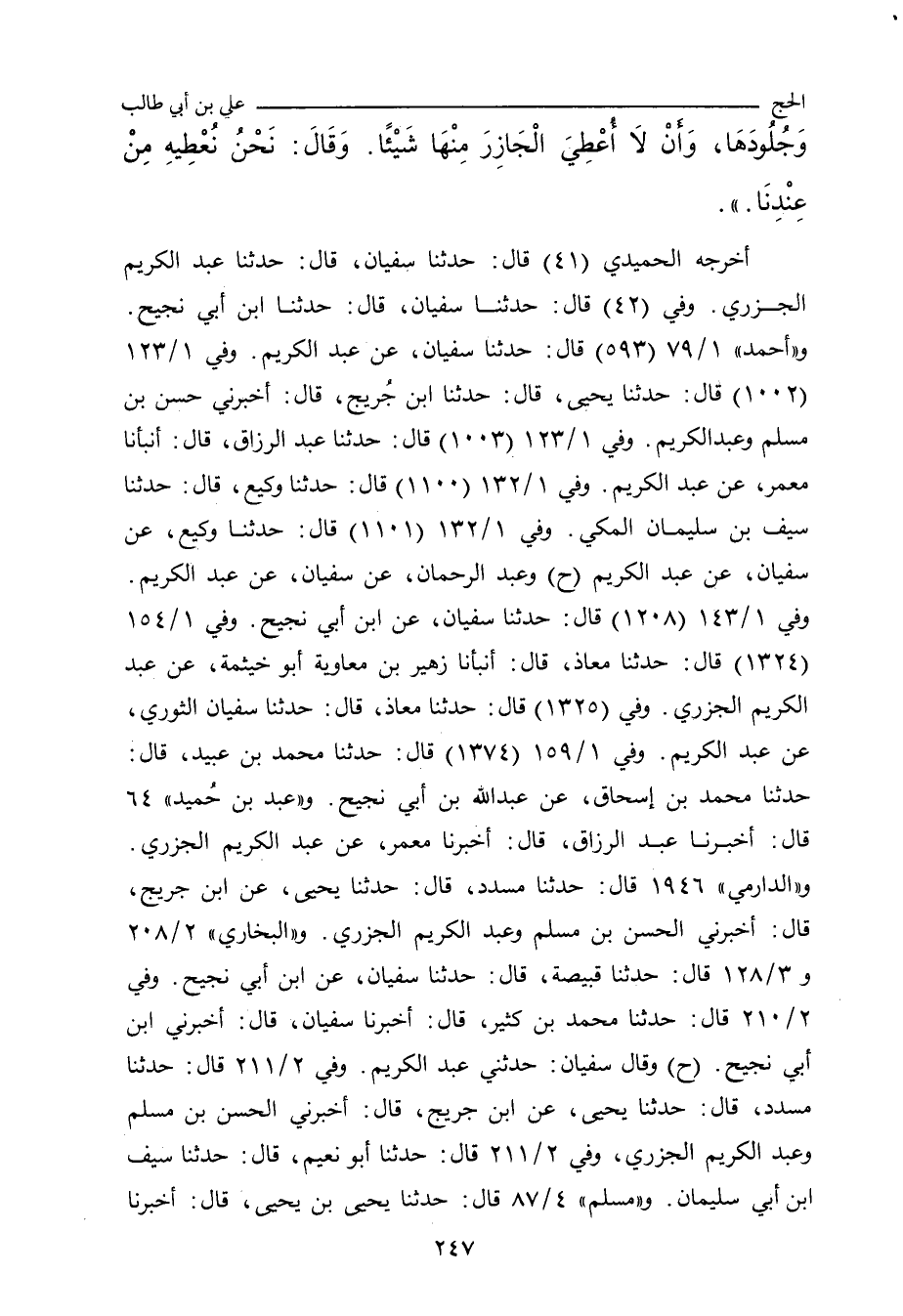 أخرجه الحُمَيْدي (٤١) قال: حدَّثنا سُفْيان، حدَّثنا عَبْد الكَرِيم الجَزَرِي. وفي (٤٢) قال: حدثتا سُفْيان، حدَّثنا ابن أَبي نَجِيح. و"أحمد" ١/ ٧٩ (٥٩٣) قال: حدَّثنا سُفْيان، عن عَبْد الكَرِيم. وفي ١/ ١٢٣ (١٠٠٢) قال: حدَّثنا يَحيى، حدَّثنا ابن جُرَيْج، أخبرني حَسَن بن مُسْلم، وعَبْد الكَرِيم. وفي (١٠٠٣) قال: حدَّثنا عَبْد الرَّزَّاق، أنبأنا مَعْمَر، عن عَبْد الكَرِيم. وفي ١/ ١٣٢ (١١٠٠) قال: حدَّثنا وَكِيع، حدَّثنا سَيْف بن سُلَيْمان المَكِّي. وفي (١١٠١) قال: حدَّثنا وَكِيع، قال: زاد سُفْيان (ح) وعَبْد الرَّحمان، عن سُفْيان، عن عَبْد الكَرِيم. وفي ١/ ١٤٣ (١٢٠٩) قال: حدَّثنا سُفْيان، عن ابن أَبي نَجِيح. وفي ١/ ١٥٤ (١٣٢٥) قال: حدَّثنا مُعَاذ، أنبأنا زُهَيْر بن مُعَاوية، أبو خَيْثَمة، عن عَبْد الكَرِيم الجَزَرِي. وفي (١٣٢٦) قال: حدَّثنا مُعَاذ، حدَّثنا سُفْيان الثَّوْرِي، عن عَبْد الكَرِيم. وفي ١/ ١٥٩ (١٣٧٤) قال: حدَّثنا مُحَمد بن عُبَيْد، حدَّثنا مُحَمد بن إِسْحاق، عن عَبْد الله بن أَبي نَجِيح. و"عَبد بن حُميد" ٦٤ قال: أَخْبَرنا عَبْد الرَّزَّاق، قال: أَخْبَرنا مَعْمَر، عن عَبْد الكَرِيم الجَزَرِي. و"الدارِمِي" ١٩٤٠ قال: حدَّثنا مُسَدَّد، حدَّثنا يَحيى، عن ابن جُرَيْج، قال: أخبرني الحَسَن بن مُسْلم، وعَبْد الكَرِيم الجَزَرِي. و"البُخَارِي" ٢/ ٢٠٨ (١٧٠٧) و ٣/ ١٢٨ (٢٢٩٩) قال: حدَّثنا قَبِيصَة، حدَّثنا سُفْيان، عن ابن أَبي نَجِيح. وفي ٢/ ٢١٠ (١٧١٦) قال: حدَّثنا مُحَمد بن كَثِير، أَخْبَرنا سُفْيان، قال: أخبرني ابن أَبي نَجِيح (ح) وقال سُفْيان: وحدَّثني عَبْد الكَرِيم. وفي ٢/ ٢١١ (١٧١٧) قال: حدَّثنا مُسَدَّد، حدَّثنا يَحيى، عن ابن جُرَيْج، قال: أخبرني الحَسَن بن مُسْلم، وعَبْد الكَرِيم الجَزَرِي. وفي (١٧١٨) قال: حدَّثنا أبو نُعَيْم، حدَّثنا