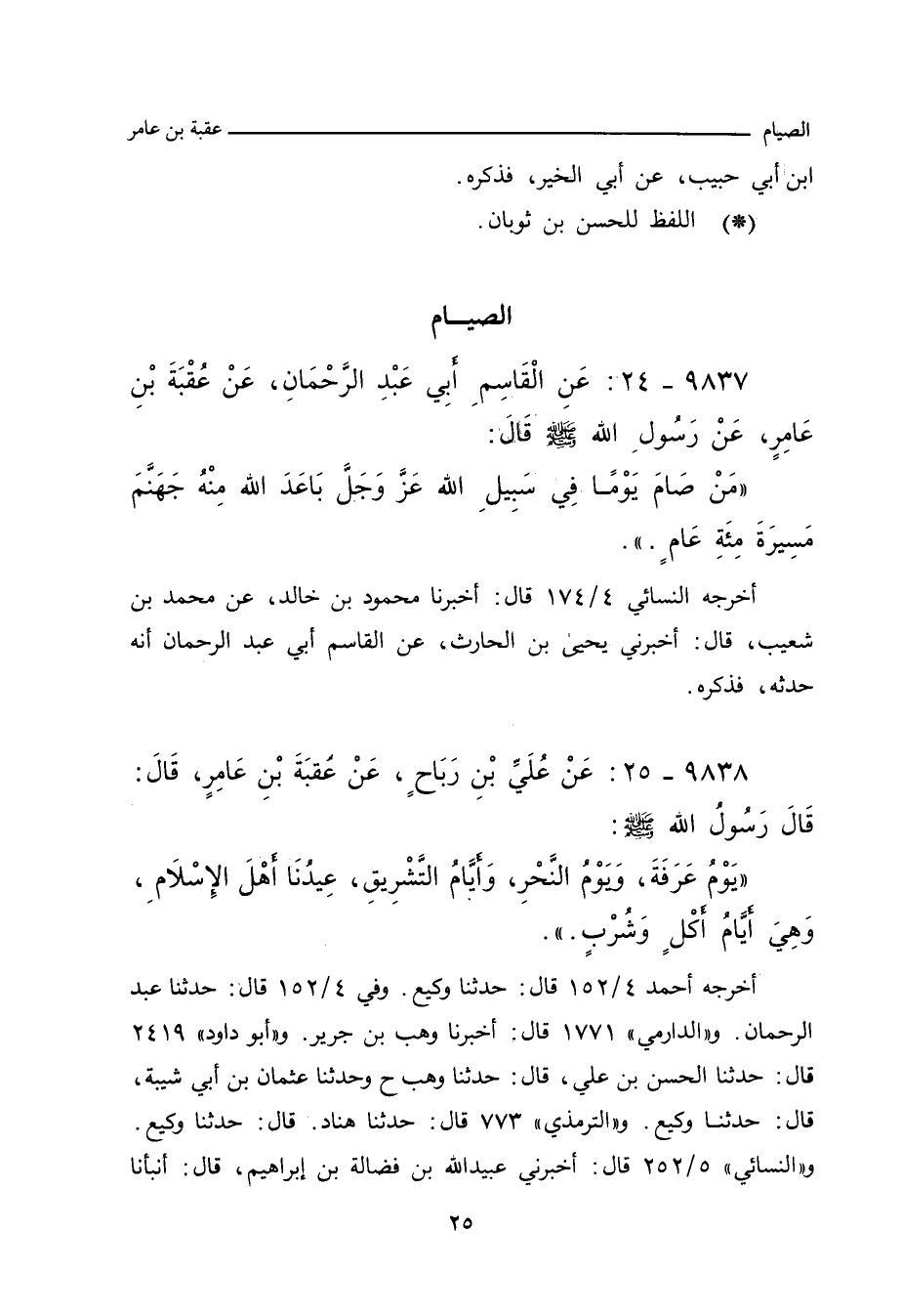 ٩٨٣٧ - عَنِ الْقَاسِمِ أَبِي عَبْدِ الرَّحْمَانِ، عَنْ عُقْبَةَ بْنِ عَامِرٍ، عَنْ رَسُولِ اللهِ صلى الله عليه وسلم، قَالَ:
