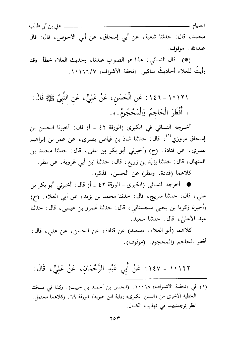 - أخرجه النَّسَائِي، في "الكبرى" ٣١٥٠ قال: أخبرني أبو بَكْر بن علي، قال: حدَّثنا سُرَيْج، قال: حدَّثنا مُحَمد بن يَزِيد، عن أَبي العَلَاء، عن قَتَادة. وفي (٣١٥١) قال: أخبرني زكريا بن يَحيى، سِجِسْتَانِيٌّ، قال: حدَّثنا عَمْرو بن عِيسَى، قال: حدَّثنا عَبْد الأَعْلى، قال: حدَّثنا سَعِيد، عن قَتَادة , عن الحَسَن، عن عليٍّ، قال: أفطر الحاجم والمحجوم.