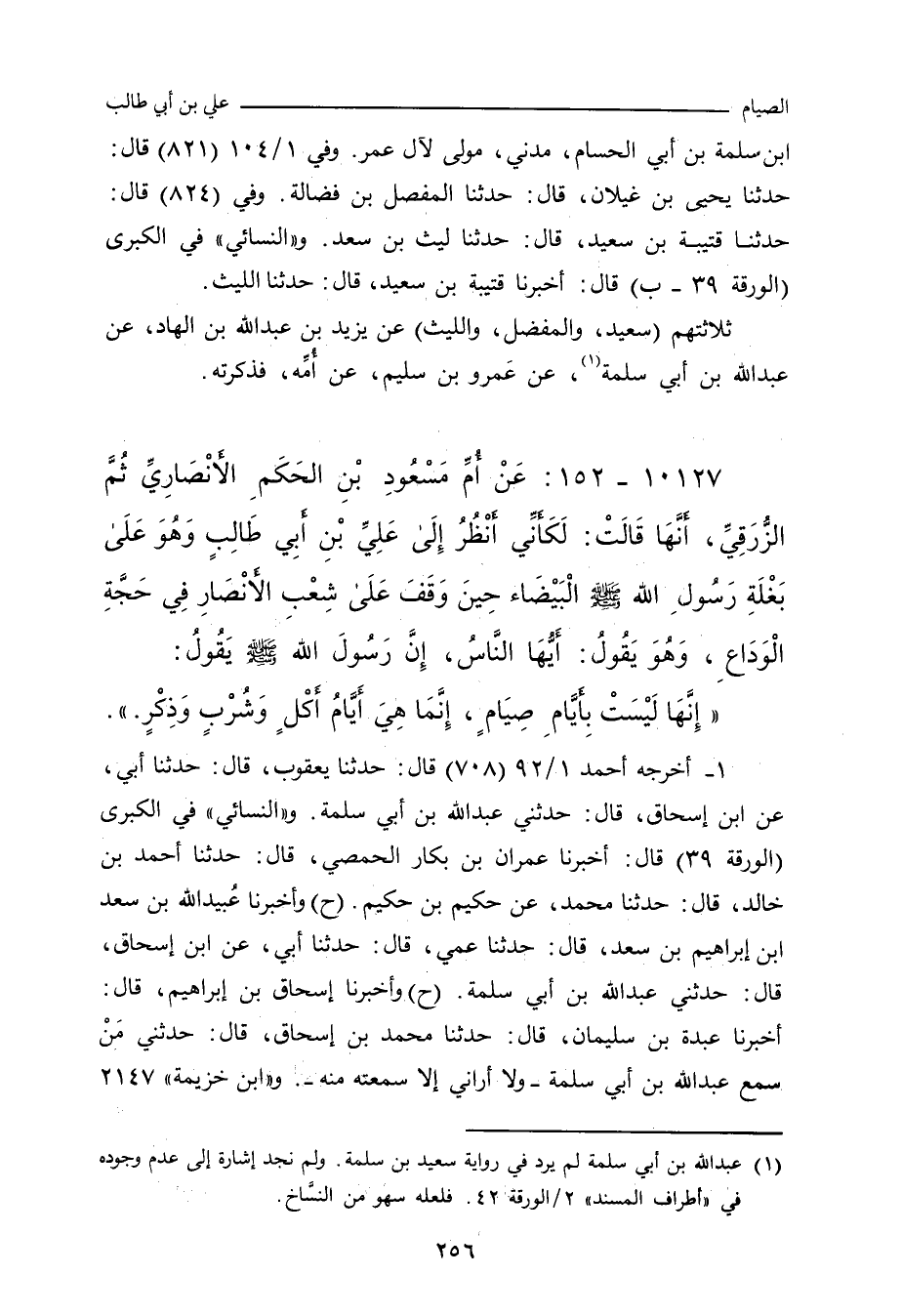 أخرجه أحمد ١/ ٩٢ (٧٠٨) قال: حدَّثنا يَعْقُوب، حدَّثنا أَبي، عن ابن إِسْحاق، حدَّثني عَبْد الله بن أَبي سَلَمَة. و"النَّسَائي" في "الكبرى" ٢٨٩٩ قال: أَخْبَرنا عِمْران بن بَكَّار الحِمْصِي، قال: حدَّثنا أحمد بن خالد، قال: حدَّثنا مُحَمد، عن حَكِيم بن حَكِيم. وفي (٢٩٠٠) قال: أَخْبَرنا عُبَيْد الله ابن سَعْد بن إبراهيم بن سَعْد، قال: حدَّثنا عَمِّي، قال: حدَّثنا أَبي، عن ابن إِسْحاق، قال: حدَّثني عَبْد الله بن أَبي سَلَمَة. وفي (٢٩٠١) قال: أَخْبَرنا إِسْحاق بن إبراهيم، قال: أَخْبَرنا عَبْدَة بن سُلَيْمان، قال: حدَّثنا مُحَمد بن إِسْحاق، قال: حدَّثني مَنْ سَمِعَ عَبْد الله بن أَبي سَلَمَة، ولَا أُراني إِلَاّ سَمِعْتُهُ منه. و"ابن خزيمة" ٢١٤٧