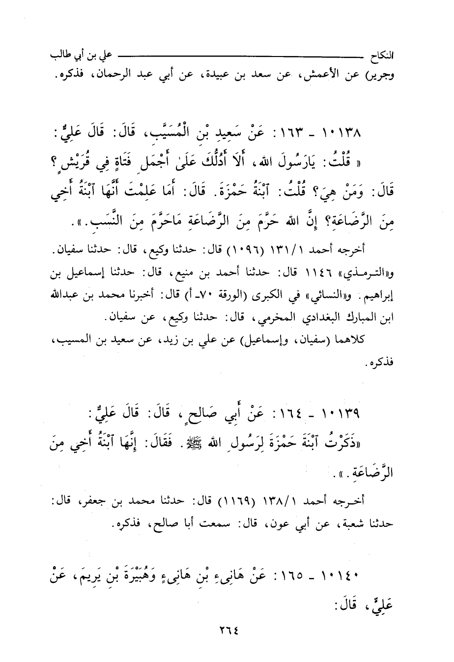 - وفي رواية: قَالَ عَلِيٌّ عَلَى الْمِنْبَرِ، وَسَأَلَهُ ابْنُ الْكَوَّاءِ عَنِ ابْنَةِ الأَخِ مِنَ الرَّضَاعَةِ، فَقَالَ عَلِيٌّ: ذَكَرْتُ لِرَسُولِ اللهِ صلى الله عليه وسلم ابْنَةَ حَمْزَةَ، فَقَالَ: وَمَا عَلِمْتَ أَنَّهَا ابْنَةُ أَخِي مِنَ الرَّضَاعَةِ؟!.