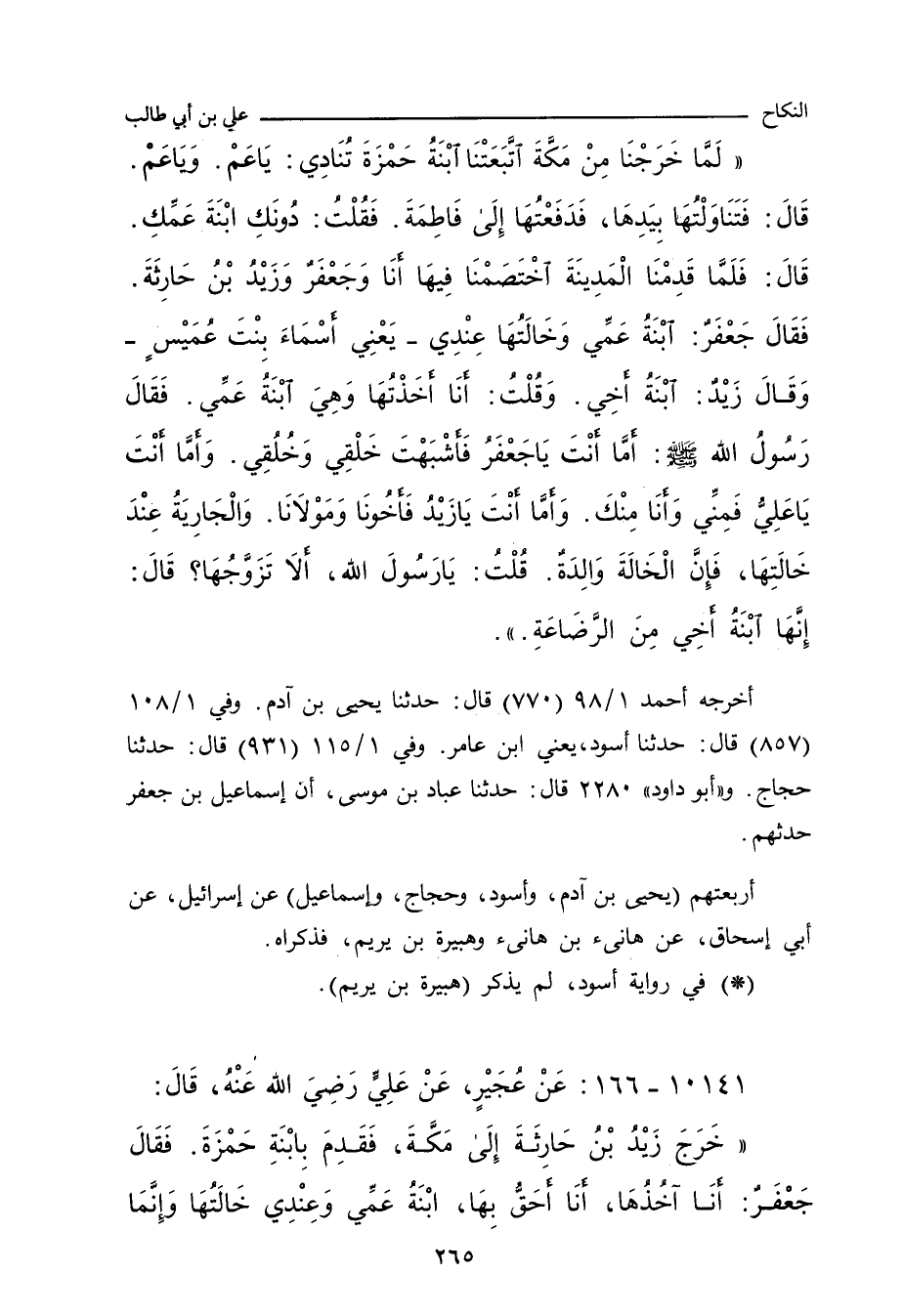 لَمَّا خَرَجْنَا مِنْ مَكَّةَ، اتَّبَعَتْنَا ابْنَةُ حَمْزَةَ تُنَادِي يَا عَمِّ، يَا عَمِّ، قَالَ: فَتَنَاوَلْتُهَا بِيَدِهَا فَدَفَعْتُهَا إِلَى فَاطِمَةَ، فَقُلْتُ: دُونَكِ ابْنَةَ عَمِّكِ، قَالَ: فَلَمَّا قَدِمْنَا الْمَدِينَةَ، اخْتَصَمْنَا فِيهَا أَنَا، وَجَعْفَرٌ، وَزَيْدُ بْنُ حَارِثَةَ، فَقَالَ جَعْفَرٌ: ابْنَةُ عَمِّي وَخَالَتُهَا عِنْدِي، يَعْنِي أَسْمَاءَ بِنْتَ عُمَيْسٍ، وَقَالَ زَيْدٌ: ابْنَةُ أَخِي، وَقُلْتُ أَنَا: أَخَذْتُهَا وَهِيَ ابْنَةُ عَمِّي، فَقَالَ رَسُولُ اللهِ صلى الله عليه وسلم: أَمَّا أَنْتَ يَا جَعْفَرُ، فَأَشْبَهْتَ خَلْقِي وَخُلُقِي، وَأَمَّا أَنْتَ يَا عَلِيُّ، فَمِنِّي وَأَنَا مِنْكَ، وَأَمَّا أَنْتَ يَا زَيْدُ، فَأَخُونَا وَمَوْلَانَا، وَالْجَارِيَةُ عِنْدَ خَالَتِهَا، فَإِنَّ الْخَالَةَ وَالِدَةٌ، قُلْتُ: يَا رَسُولَ اللهِ، أَلَا تَزَوَّجُهَا؟ قَالَ: إِنَّهَا ابْنَةُ أَخِي مِنَ الرَّضَاعَةِ.