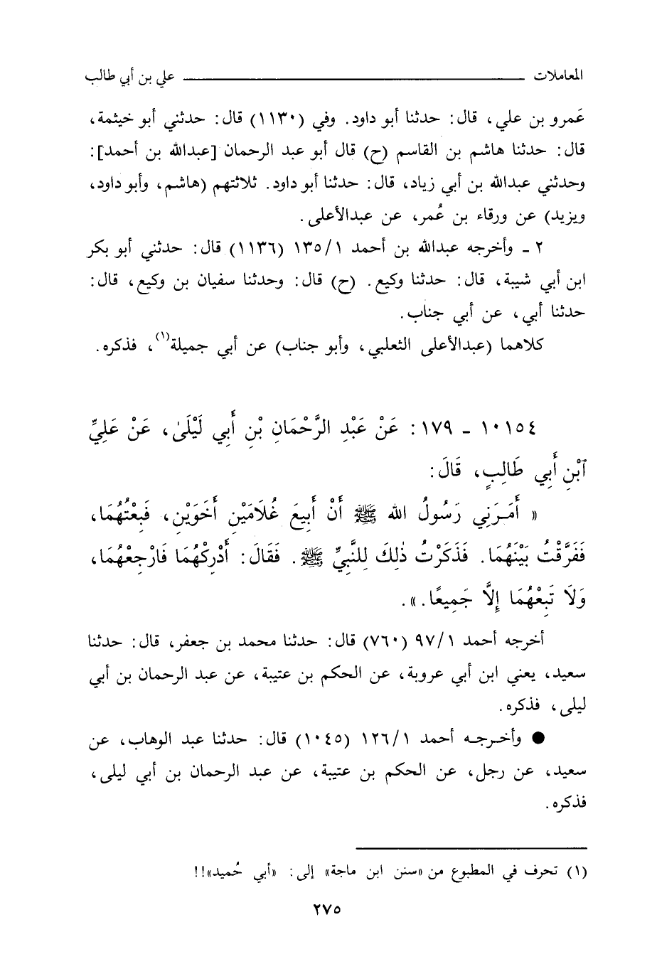 - أخرجه أحمد ١/ ٩٧ (٧٦٠) قال: حدَّثنا مُحَمد بن جَعْفَر، حدَّثنا سَعِيد، يعني ابن أَبي عَرُوبَة، عن الحَكَم بن عُتَيْبَة، عن عَبْد الرَّحمان بن أَبي لَيْلَى، عَنْ عَلِيِّ بْنِ أَبِي طَالِبٍ، قَالَ: