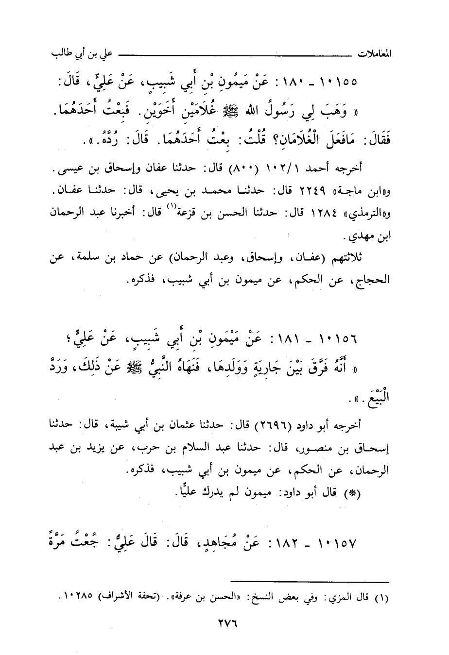 - وفي رواية: وَهَبَ لِي رَسُولُ اللهِ صلى الله عليه وسلم غُلَامَيْنِ أَخَوَيْنِ، فَبِعْتُ أَحَدَهُمَا، فَقَالَ لِي رَسُولُ اللهِ صلى الله عليه وسلم: يَا عَلِيُّ، مَا فَعَلَ غُلَامُكَ؟ فَأَخْبَرْتُهُ، فَقَالَ: رُدَّهُ، رُدَّهُ.