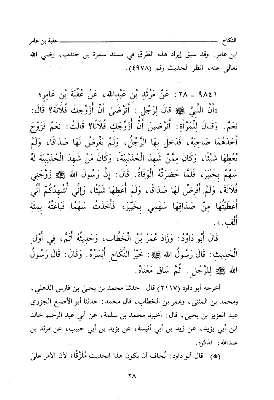 قَالَ أَبُو دَاوُدُ: وَزَادَ عُمَرُ بْنُ الْخَطَّابِ، وَحَدِيثُهُ أَتَمُّ، فِي أَوَّلِ الْحَدِيثِ: قَالَ رَسُولُ اللهِ صلى الله عليه وسلم: خَيْرُ النِّكَاحِ أَيْسَرُهُ، وَقاَلَ: قَالَ رَسُولُ اللهِ صلى الله عليه وسلم لِلرَّجُلِ. ثُمَّ سَاقَ مَعْنَاهُ.