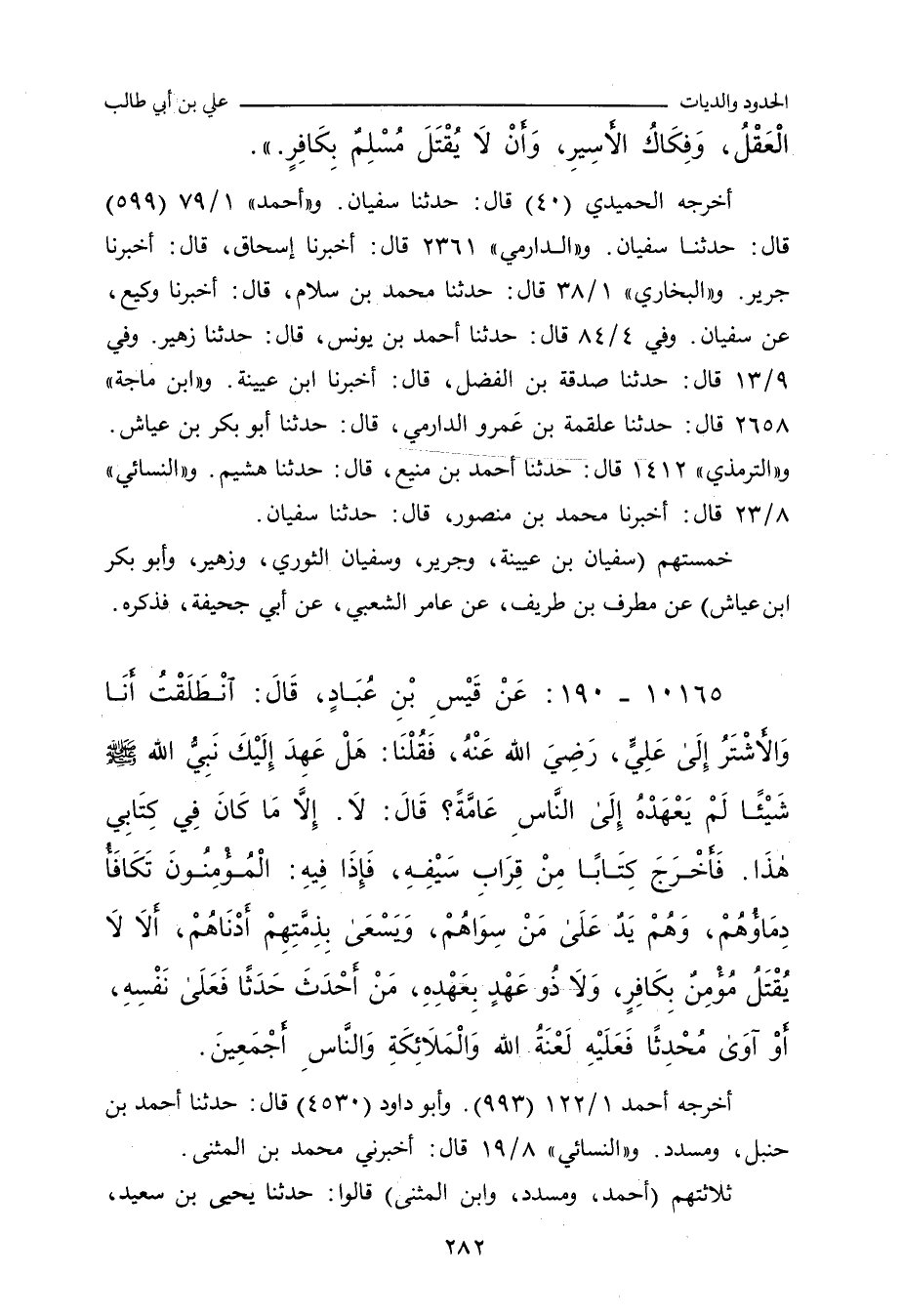 ١٠١٦٥ - عَنْ قَيْسِ بْنِ عُبَادٍ، قَالَ: انْطَلَقْتُ أَنَا وَالأَشْتَرُ إِلَى عَلِيٍّ، رَضِىَ اللَّهُ عَنْهُ، فَقُلْنَا: هَلْ عَهِدَ إِلَيْكَ نَبِيُّ اللهِ صلى الله عليه وسلم شَيْئًا لَمْ يَعْهَدْهُ إِلَى النَّاسِ عَامَّةً؟ قَالَ: لَا، إِلَاّ مَا كَانَ فِي كِتَابِي هَذَا، فَأَخْرَجَ كِتَابًا مِنْ قِرَابِ سَيْفِهِ، فَإِذَا فِيهِ: