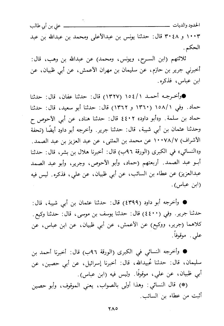 - قال أبو عِيسَى التِّرْمِذيُّ (١٤٢٣): وقد رُوِيَ هذا الحديث عن عَطَاء بن السَّائب، عن أَبي ظَبْيَان، عن علي بن أَبي طالب، عن النَّبِيِّ صلى الله عليه وسلم. نحو هذا الحديث.