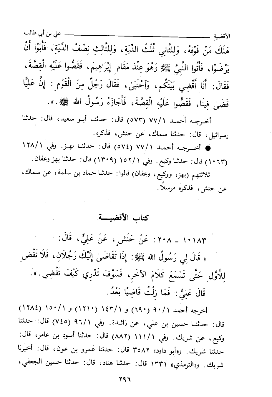 - وفي رواية: قَالَ لِي رَسُولُ اللهِ صلى الله عليه وسلم: إِذَا تَقَاضَى إِلَيْكَ رَجُلَانِ، فَلَا تَقْضِ لِلأَوَّلِ حَتَّى تَسْمَعَ كَلَامَ الآخَرِ، فَسَوْفَ تَدْرِي كَيْفَ تَقْضِي. قَالَ عَلِيٌّ: فَمَا زِلْتُ قَاضِيًا بَعْدُ.