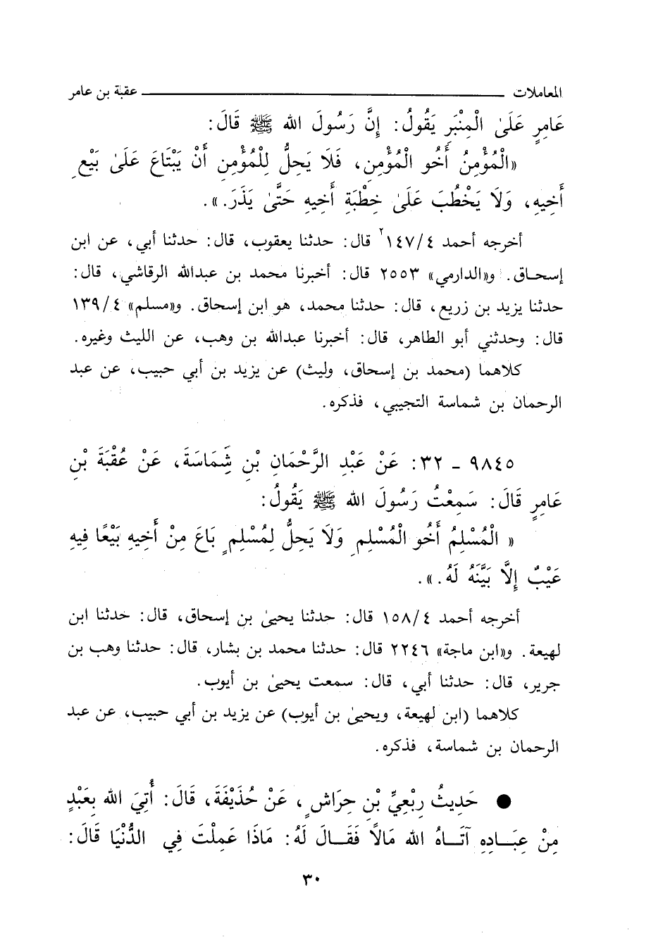 ٩٨٤٥ - عَنْ عَبْدِ الرَّحْمَانِ بْنِ شَِمَاسَةَ، عَنْ عُقْبَةَ بْنِ عَامِرٍ، قَالَ: قَالَ رَسُولُ اللهِ صلى الله عليه وسلم: