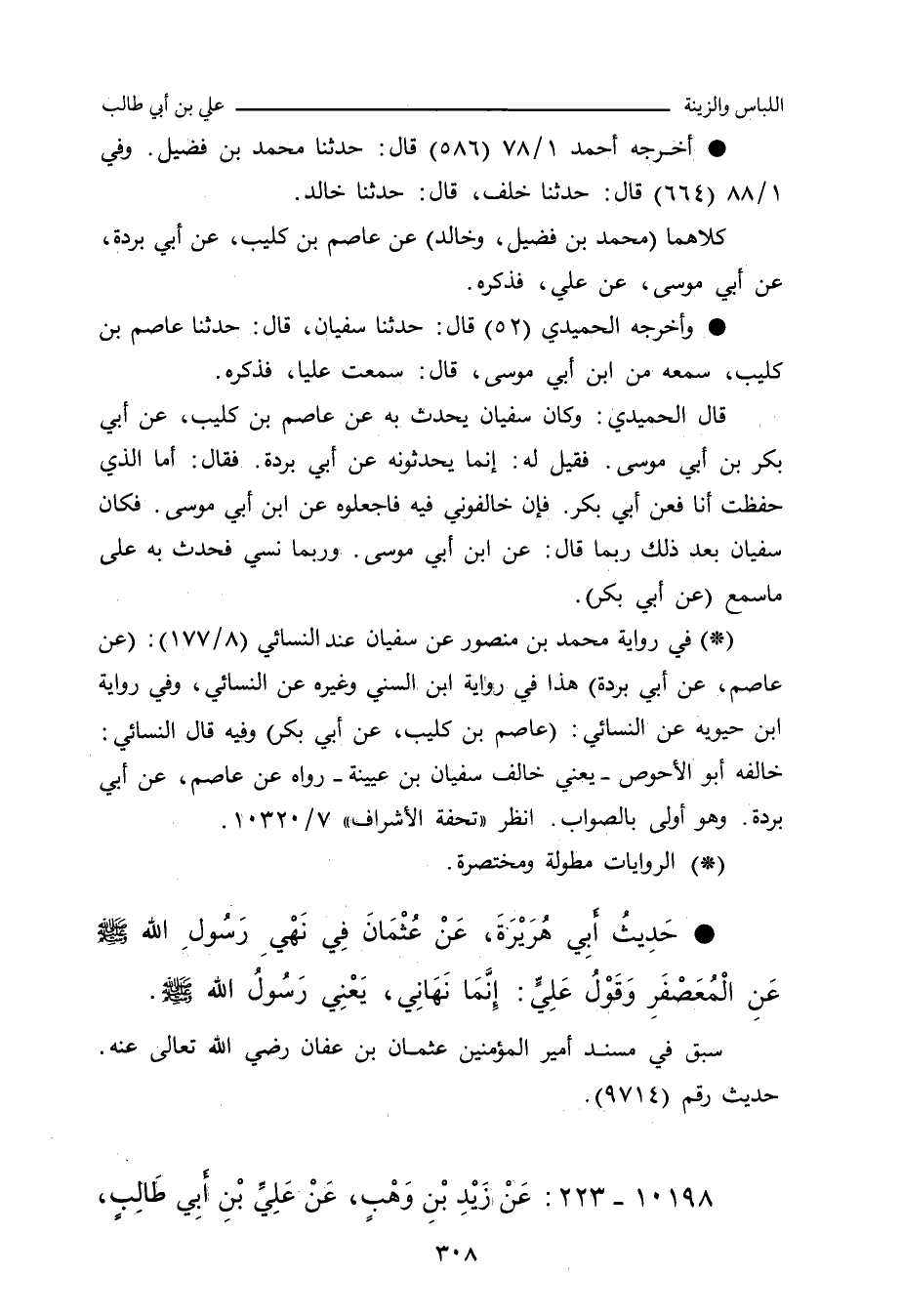 - حَدِيثُ أَبِي هُرَيْرَةَ، عَنْ عُثْمَانَ؛ فِي نَهْيِ رَسُولُ اللهِ صلى الله عليه وسلم عَنِ الْمُعَصْفَرِ، وَقَوْلُ عَلِيٍّ: إِنَّمَا نَهَانِي، يَعْنِي رَسُولُ اللهِ صلى الله عليه وسلم.