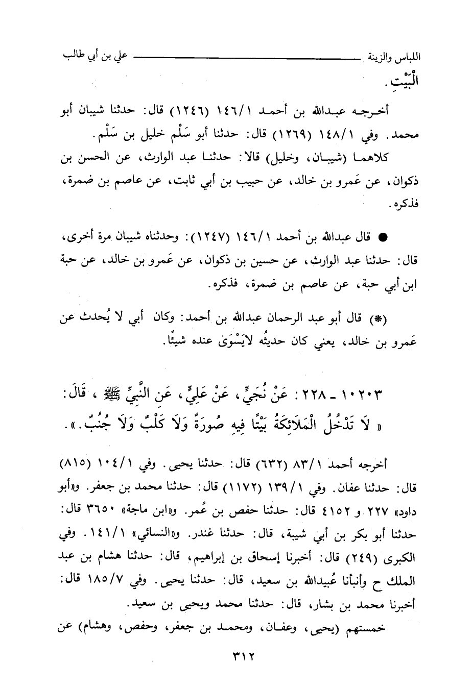 - قال عَبْد الله بن أحمد ١/ ١٤٦ (١٢٤٨): وحدَّثناه شَيْبان مَرَّةً أُخرى، حدَّثنا عَبْد الوارث، عن حُسَين بن ذَكْوَان، عن عَمْرو بن خالد، عن حَبَّة بن أَبي حَبَّة، عَنْ عَاصِمِ بْنِ ضَمْرَةَ، عَنْ عَلِيِّ بْنِ أَبِي طَالِبٍ، عَنِ النَّبِيِّ صلى الله عليه وسلم، قَالَ: أَتَانِي جِبْرِيلُ يُسَلِّمُ عَلَيَّ. فَذَكَرَ الْحَدِيثَ مِثْلَهُ نَحْوَهُ.