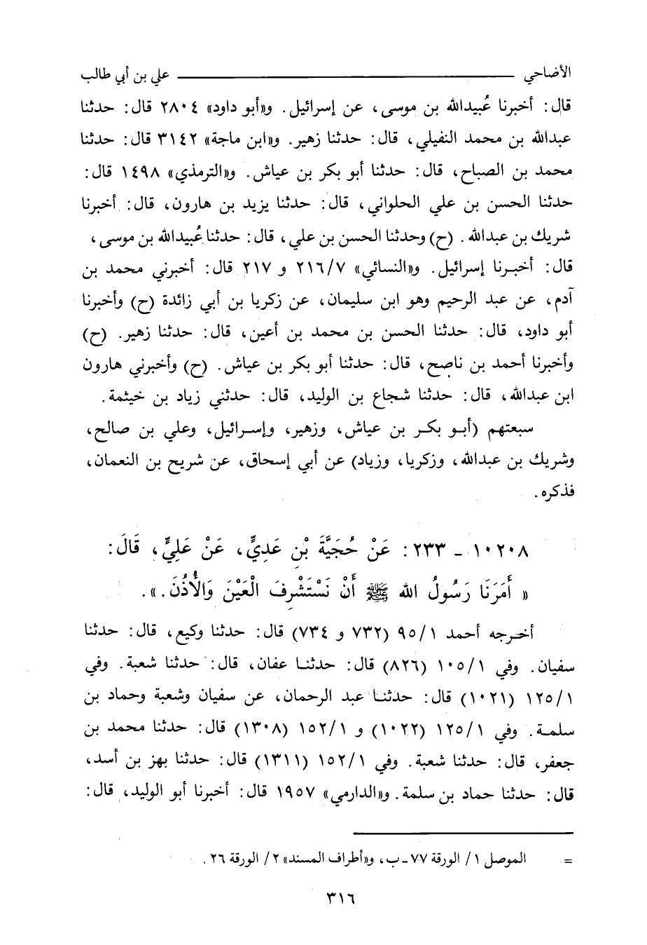 - وفي رواية: عَنْ حُجَيَّةَ بْنِ عَدِيٍّ، عَنْ عَلِيٍّ، قَالَ: الْبَقَرَةُ عَنْ سَبْعَةٍ، قُلْتُ: فَإِنْ وَلَدَتْ؟ قَالَ: اذْبَحْ وَلَدَهَا مَعَهَا، قُلْتُ: فَالْعَرْجَاءُ؟ قَالَ: إِذَا بَلَغَتِ الْمَنْسَكَ، قُلْتُ: فَمَكْسُورَةُ الْقَرْنِ؟ قَالَ: لَا بَأْسَ؛ أُمِرْنَا، أَوْ أَمَرَنَا، رَسُولُ اللهِ صلى الله عليه وسلم أَنْ نَسْتَشْرِفَ الْعَيْنَيْنِ وَالأُذُنَيْنِ.