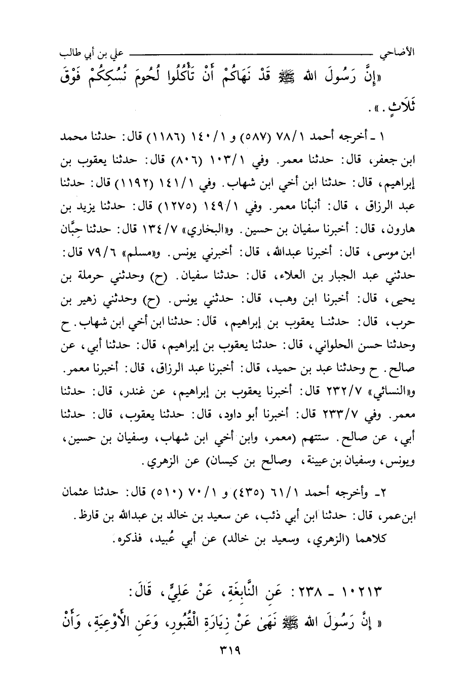 - وفي رواية: عَنْ أَبِي عُبَيْدٍ، مَوْلَى عَبْدِ الرَّحْمَانِ بْنِ عَوْفٍ، قَالَ: سَمِعْتُ عَلِيًّا يَقُولُ: نَهَانِي رَسُولُ اللهِ صلى الله عليه وسلم أَنْ نَحْبِسَ لُحُومَ الأَضَاحِي فَوْقَ ثَلَاثٍ.