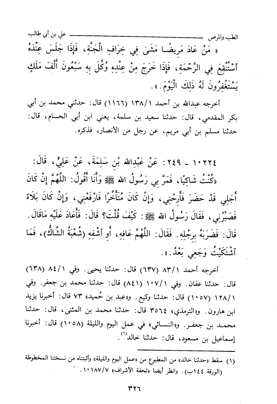 - وفي رواية: عَنْ عَبْدِ اللهِ بْنِ سَلِمَةَ؛ أَنَّ عَلِيًّا اشْتَكَى، فَقَالَ: اللَّهُمَّ إِنْ كَانَ أَجَلِي قَدْ حَضَرَ فَأَرِحْنِي، وَإِنْ كَانَ بَلَاءً فَصَبِّرْنِي، وَإِنْ كَانَ إِلَى أَجَلٍ فَعَافِنِي، قَالَ عَلِيٌّ: فَمَرَّ بِيَ النَّبِيُّ صلى الله عليه وسلم وَأَنَا أَقُولُ ذَلِكَ، فَقَالَ: كَيْفَ قُلْتَ؟ قَالَ: فَأَعَدْتُ عَلَيْهِ الْكَلَامَ، فَقَالَ: اللَّهُمَّ اشْفِهِ وَعَافِهِ، قَالَ: فَشُفِيتُ فَمَا اشْتَكَيْتُ ذَلِكَ الْوَجَعَ بَعْدُ.