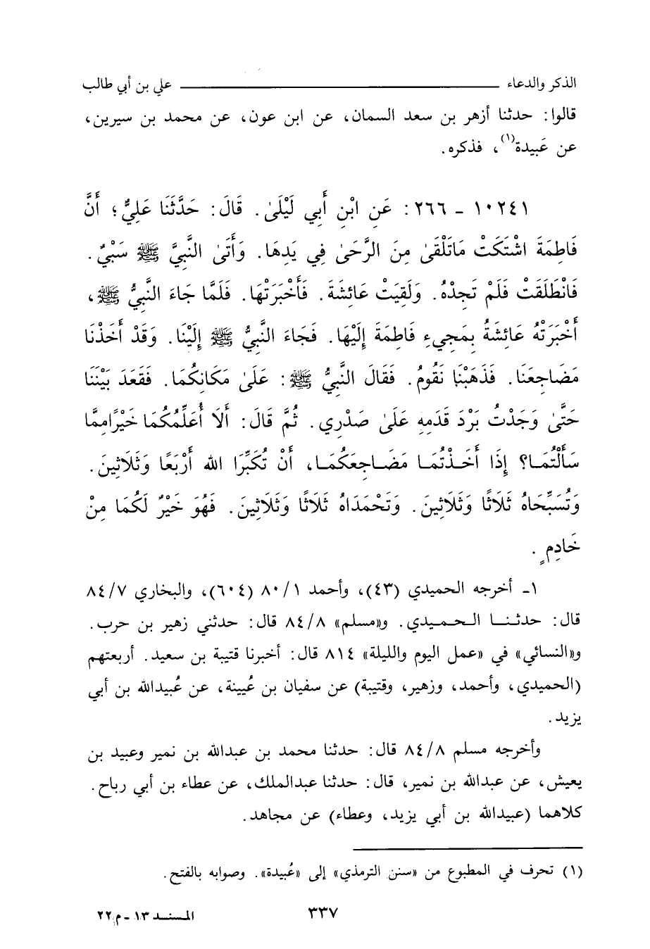 أَنَّ فَاطِمَةَ اشْتَكَتْ مَا تَلْقَى مِنْ أَثَرِ الرَّحَى فِي يَدِهَا، وَأَتَى النَّبِيَّ صلى الله عليه وسلم سَبْىٌ، فَانْطَلَقَتْ فَلَمْ تَجِدْهُ، وَلَقِيَتْ عَائِشَةَ، فَأَخْبَرَتْهَا، فَلَمَّا جَاءَ النَّبِيُّ صلى الله عليه وسلم أَخْبَرَتْهُ عَائِشَةُ بِمَجِئِ فَاطِمَةَ إِلَيْهَا، فَجَاءَ النَّبِيُّ صلى الله عليه وسلم، وَقَدْ أَخَذْنَا مَضَاجِعَنَا، فَذَهَبْنَا لِنَقُومَ، فَقَالَ النَّبِيُّ صلى الله عليه وسلم: عَلَى مَكَانِكُمَا، فَقَعَدَ بَيْنَنَا، حَتَّى وَجَدْتُ بَرْدَ قَدَمَيْهِ عَلَى صَدْرِي، فَقَالَ: أَلَا أُعَلِّمُكُمَا خَيْرًا مِمَّا سَأَلْتُمَا؟ إِذَا أَخَذْتُمَا مَضَاجِعَكُمَا، أَنْ تُكَبِّرَا اللَّهَ أَرْبَعًا وَثَلَاثِينَ، وَتُسَبِّحَاهُ ثَلَاثًا وَثَلَاثِينَ، وَتَحْمَدَاهُ ثَلَاثًا وَثَلَاثِينَ، فَهُوَ خَيْرٌ لَكُمَا مِنْ خَادِمٍ.