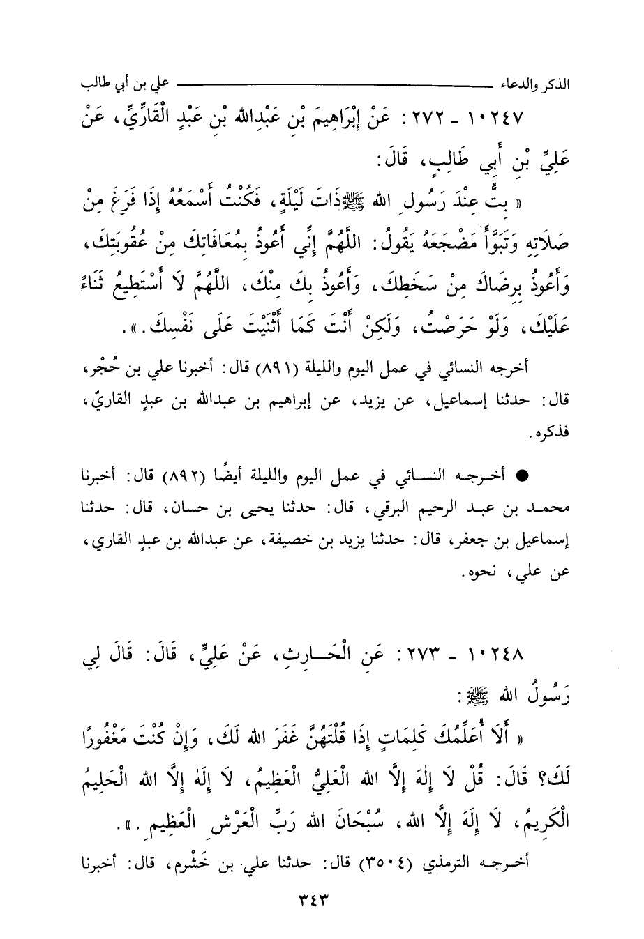 - أخرجه النَّسَائِي (٨٩٢) قال: أَخْبَرنا مُحَمد بن عَبْد الرَّحِيم البَرْقِي، قال: حدَّثنا يَحيى بن حَسَّان، قال: حدَّثنا إِسْماعِيل بن جَعْفَر، قال: حدَّثنا يَزِيد بن خُصَيْفَة، عن عَبْد الله بن عَبْدٍ القَارِّيّ , عن عليٍّ، نحوه.