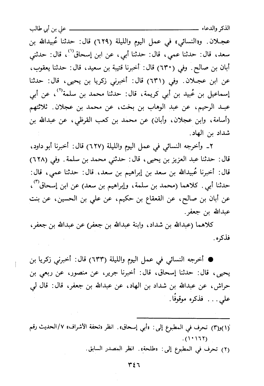 عَجْلان، عن مُحَمد بن كَعْب القُرَظِي , عن عَبْد الله بن شَدَّاد بن الهاد. و"النَّسَائي" في "الكبرى" ٧٦٢٦، وفي "عمل اليوم والليلة"٦٣٠ قال: أَخْبَرنا قُتَيْبة بن سَعِيد، قال: حدَّثنا يَعْقُوب , عن ابن عَجْلان، عن مُحَمد بن كَعْب القُرَظِي , عن عَبْد الله بن الهاد. وفي "عمل اليوم والليلة"٦٢٨ و ٦٢٩ قال: حدَّثنا عُبَيْد الله بن سَعْد، قال: حدَّثنا عَمِّي، قال: حدَّثنا أَبي , عن ابن إِسْحاق، قال: حدَّثني أَبَان بن صالح، عن مُحَمد بن كَعْب , عن عَبْد الله بن شَدَّاد.