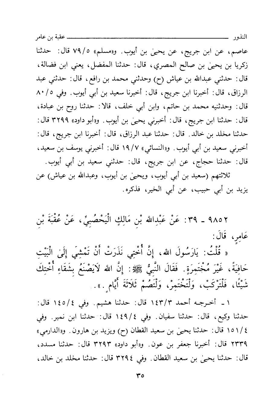 عاصم، عن ابن جُرَيْج، عن يَحيى بن أَيُّوب. و"مسلم"٥/ ٧٩ (٤٢٦٠) قال: حدَّثنا زكريا بن يَحيى بن صالح المِصْرِي، حدَّثنا المُفَضَّل، يعني ابن فَضَالَة، حدَّثني عَبْد الله بن عَيَّاش. وفي (٤٢٦١) قال: وحدَّثني مُحَمد بن رافع، حدَّثني عَبْد الرَّزَّاق، أَخْبَرنا ابن جُرَيْج، أَخْبَرنا سَعِيد بن أَبي أَيُّوب. وفي ٥/ ٨٠ (٤٢٦٢) قال: وحدَّثني هـ مُحَمد بن حاتم، وابن أَبي خَلَف، قالا: حدَّثنا رَوْح بن عُبَادة، حدَّثنا ابن جُرَيْج، أخبرني يَحيى بن أَيُّوب. و"أبو داود"٣٢٩٩ قال: حدَّثنا مَخْلَد بن خالد، حدَّثنا عَبْد الرَّزَّاق، أَخْبَرنا ابن جُرَيْج، أخبرني سَعِيد بن أَبي أَيُّوب. و"النَّسائي"٧/ ١٩، وفي "الكبرى"٤٧٣٧ قال: أخبرني يُوسُف بن سَعِيد، قال: حدَّثنا حَجَّاج، عن ابن جُرَيْج، قال: حدَّثني سَعِيد بن أَبي أَيُّوب.