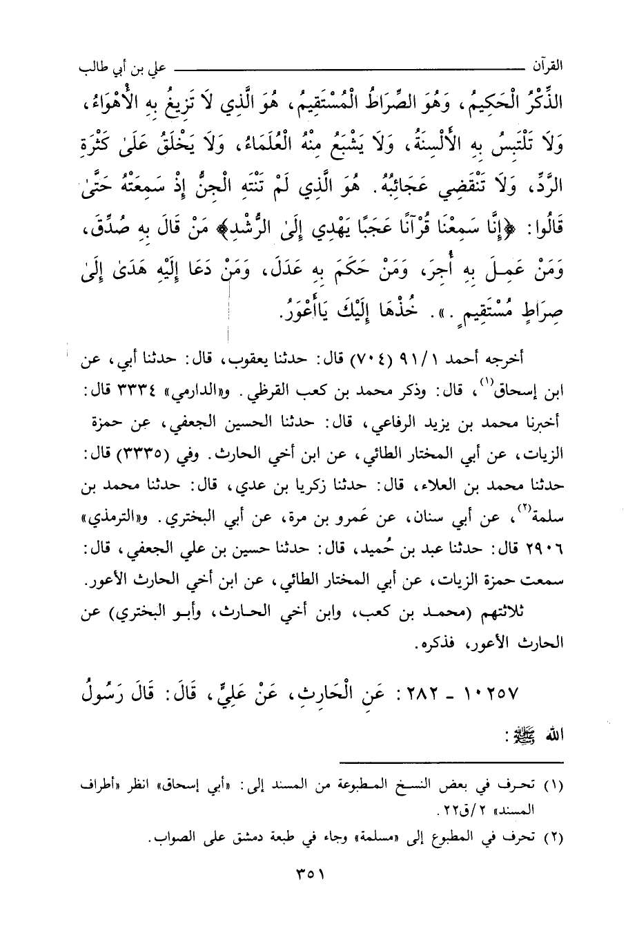 - وفي رواية: عَنِ الْحَارِثِ بْنِ عَبْدِ اللهِ الأَعْوَرِ، قَالَ: قُلْتُ: لآتِيَنَّ أَمِيرَ الْمُؤْمِنِينَ فَلأَسْأَلَنَّهُ عَمَّا سَمِعْتُ الْعَشِيَّةَ، قَالَ: فَجِئْتُهُ بَعْدَ الْعِشَاءِ، فَدَخَلْتُ عَلَيْهِ، فَذَكَرَ الْحَدِيثَ، قَالَ: ثُمَّ قَالَ: سَمِعْتُ رَسُولَ اللهِ صلى الله عليه وسلم يَقُولُ: أَتَانِي جِبْرِيلُ، فَقَالَ: يَا مُحَمَّدُ، إِنَّ أُمَّتَكَ مُخْتَلِفَةٌ بَعْدَكَ، قَالَ: فَقُلْتُ لَهُ: فَأَيْنَ الْمَخْرَجُ يَا جِبْرِيلُ؟ قَالَ: فَقَالَ: كِتَابُ اللهِ تَعَالَى، بِهِ يَقْصِمُ اللَّهُ كُلَّ جَبَّارٍ، مَنِ اعْتَصَمَ بِهِ نَجَا، وَمَنْ تَرَكَهُ هَلَكَ، مَرَّتَيْن، قَوْلٌ فَصْلٌ، وَلَيْسَ بِالْهَزْلِ، لَا تَخْتَلِقُهُ الأَلْسُنُ، وَلَا تَفْنَى أَعَاجِيبُهُ، فِيهِ نَبَأُ مَا كَانَ قَبْلَكُمْ، وَفَصْلُ مَا بَيْنَكُمْ، وَخَبَرُ مَا هُوَ كَائِنٌ بَعْدَكُمْ.