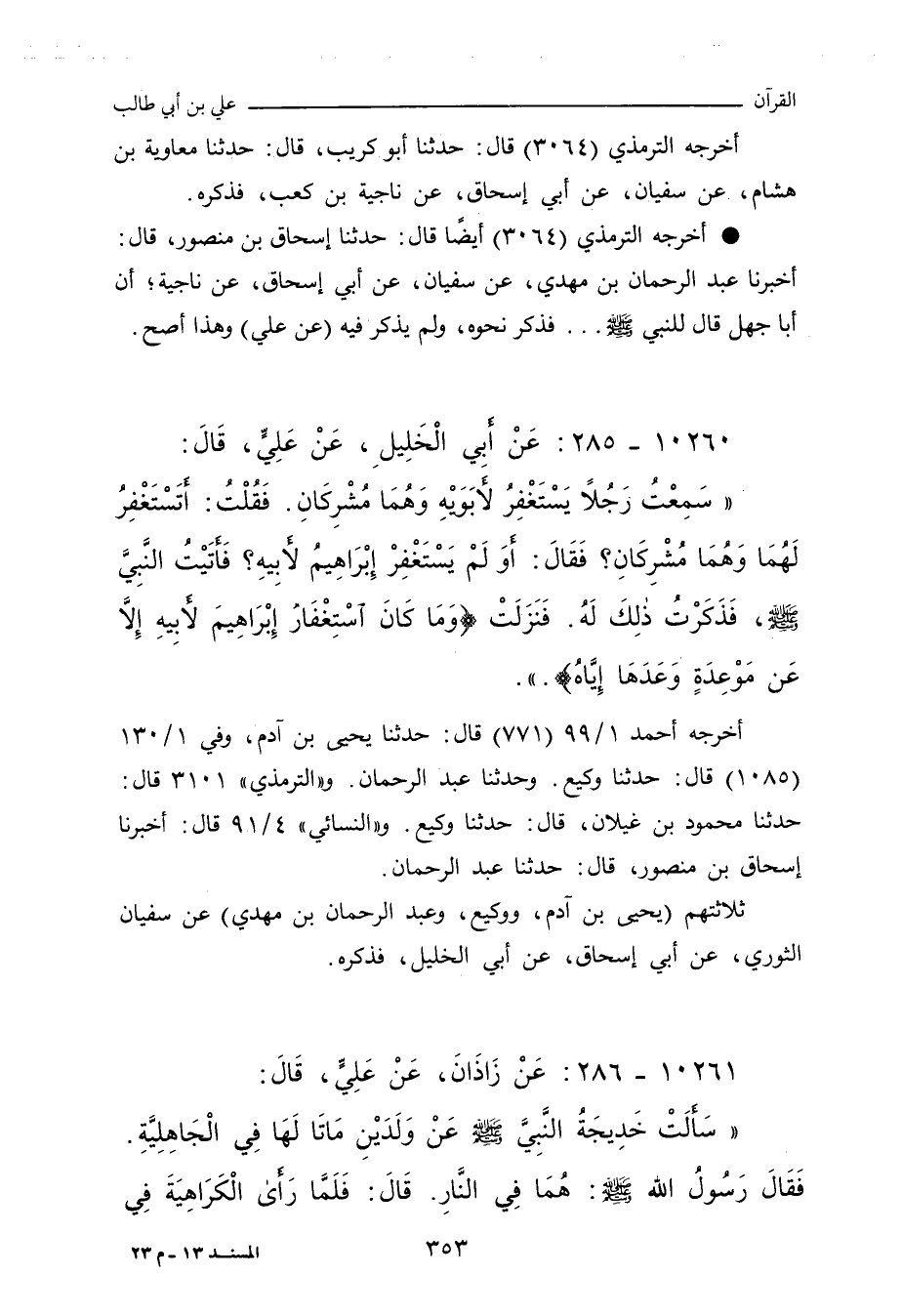 قال التِّرْمِذي: حدَّثنا إِسْحاق بن مَنْصُور، أَخْبَرنا عَبْد الرَّحمان ابن مَهْدِي , عن سُفْيان , عن أَبي إِسْحاق , عن ناجية؛ أن أبا جهلٍ قال للنَّبِيِّ صلى الله عليه وسلم. فذكر نحوه (٣. ولم يذكر فيه: عن عليٍّ)، وهذا أصح (٣.