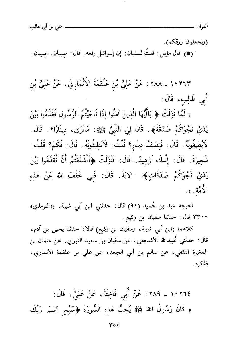 لَمَّا نَزَلَتْ هَذِهِ الآيَةُ: "يَا أَيُّهَا الَّذِينَ آمَنُوا إِذَا نَاجَيْتُمُ الرَّسُولَ فَقَدِّمُوا بَيْنَ يَدَيْ نَجْوَاكُمْ صَدَقَةً) قَالَ: قَالَ النَّبِيُّ صلى الله عليه وسلم لِعَلِيٍّ: يَا عَلِيُّ، مُرْهُمْ أَنْ يَتَصَدَّقُوا، قَالَ: يَا رَسُولَ اللهِ، بِكَمْ؟ قَالَ: بِدِينَارٍ، قَالَ: لَا يُطِيقُونَهُ، قَالَ: فَبِنْصِفِ دِينَارٍ؟ قَالَ: لَا يُطِيقُونَهُ، قَالَ: فَبِكَمْ؟ قَالَ: بِشَعِيرَةٍ، قَالَ: فَقَالَ النَّبِيُّ صلى الله عليه وسلم لِعَلِيٍّ: إِنَّكَ لَزَهِيدٌ، قَالَ: فَأَنْزَلَ اللَّهُ: "أَأَشْفَقْتُمْ أَنْ تُقَدِّمُوا بَيْنَ يَدَيْ نَجْوَاكُمْ صَدَقَاتٍ فَإِذْ لَمْ تَفْعَلُوا وَتَابَ اللَّهُ عَلَيْكُمْ فَأَقِيمُوا الصَّلَاة وَآتُوا الزَّكَاةَ) قَالَ: فَكَانَ عَلِيٌّ يَقُولُ: بِي خُفِّفَ عَنْ هَذِهِ الأُمَّةِ.