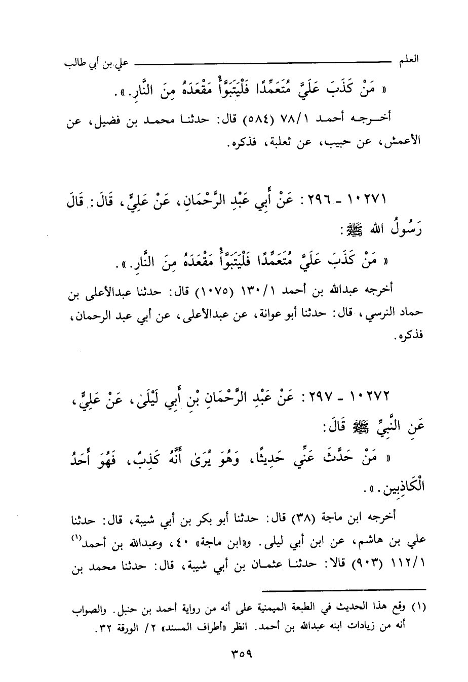 أخرجه ابن ماجة ٣٨ قال: حدَّثنا أبو بَكْر ابن أَبي شَيْبَة، حدَّثنا علي بن هاشم، عن ابن أَبي لَيْلَى. وفي (٤٠) قال: حدَّثنا عُثْمان بن أَبي شَيْبَة، حدَّثنا مُحَمد بن فُضَيْل , عن الأَعْمَش. و (عبد الله بن أحمد) ١/ ١١٢ (٩٠٣) قال: حدَّثني عُثْمان بن مُحَمد بن أَبي شَيْبَة، حدَّثنا ابن