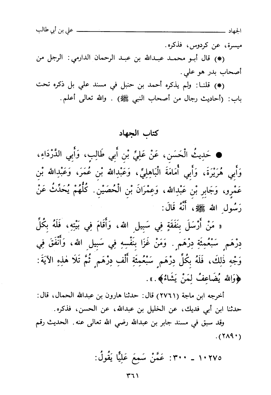 مَنْ أَرْسَلَ بِنَفَقَةٍ فِي سَبِيلِ اللهِ، وَأَفَامَ فِي بَيْتِهِ، فَلَهُ بِكُلِّ دِرْهَمٍ سَبْعُمِئَةِ دِرْهَمٍ، وَمَنْ غَزَا بِنَفْسِهِ فِي سَبِبلِ اللهِ، وَأَنْفَقَ فِي وَجْهِ ذَلِكَ، فَلَهُ بِكُلِّ دِرْهَمٍ سَبْعُمِئَةِ أَلْفِ دِرْهَمٍ، ثُمَّ تَلَا هَذِهِ الآيَةَ: "وَاللهُ يُضَاعِفُ لِمَنْ يَشَاءُ".