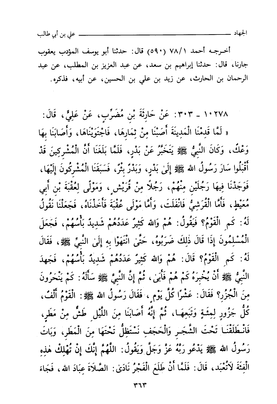 لَمَّا قَدِمْنَا الْمَدِينَةَ أَصَبْنَا مِنْ ثِمَارِهَا، فَاجْتَوَيْنَاهَا، وَأَصَابنا بِهَا وَعْكٌ، وَكَانَ النَّبِيُّ صلى الله عليه وسلم يَتَخَبَّرُ عَنْ بَدْرٍ، فَلَمَّا بَلَغَنَا أَنَّ الْمُشْرِكِينَ قَدْ أَقْبَلُوا، سَارَ رَسُولُ اللهِ صلى الله عليه وسلم إِلَى بَدْرٍ، وَبَدْرٌ بِئْرٌ، فَسَبَقْنَا الْمُشْرِكِينَ إِلَيْهَا، فَوَجَدْنَا فِيهَا رَجُلَيْنِ، مِنْهُمْ رَجُلاً مِنْ قُرَيْشٍ، وَمَوْلًى لِعُقْبَةَ بْنِ أَبِي مُعَيْطٍ، فَأَمَّا الْقُرَشِيُّ فَانْفَلَتَ، وَأَمَّا مَوْلَى عُقْبَةَ فَأَخَذْنَاهُ، فَجَعَلْنَا نَقُولُ لَهُ: كَمِ الْقَوْمُ؟ فَيَقُولُ: هُمْ وَاللهِ كَثِيرٌ عَدَدُهُمْ، شَدِيدٌ بَأْسُهُمْ، فَجَعَلَ الْمُسْلِمُونَ إِذْ قَالَ ذَلِكَ ضَرَبُوهُ، حَتَّى انْتَهَوْا بِهِ إِلَى النَّبِيِّ صلى الله عليه وسلم، فَقَالَ لَهُ: كَمِ الْقَوْمُ؟ قَالَ: هُمْ وَاللهِ كَثِيرٌ عَدَدُهُمْ، شَدِيدٌ بَأْسُهُمْ، فَجَهَدَ النَّبِيُّ صلى الله عليه وسلم أَنْ يُخْبِرَهُ كَمْ هُمْ فَأَبَى، ثُمَّ إِنَّ النَّبِيَّ صلى الله عليه وسلم سَأَلَهُ: كَمْ يَنْحَرُونَ مِنَ الْجُزُرِ؟ فَقَالَ: عَشْرًا كُلَّ يَوْمٍ، فَقَالَ رَسُولُ اللهِ صلى الله عليه وسلم: الْقَوْمُ أَلْفٌ، كُلُّ جَزُورٍ لِمِئَةٍ وَتَبِعَهَا، ثُمَّ إِنَّهُ أَصَابَنَا مِنَ اللَّيْلِ طَشٌّ مِنْ مَطَرٍ، فَانْطَلَقْنَا تَحْتَ الشَّجَرِ وَالْحَجَفِ، نَسْتَظِلُّ تَحْتَهَا مِنَ الْمَطَرِ، وَبَاتَ رَسُولُ اللهِ صلى الله عليه وسلم يَدْعُو رَبَّهُ، عَزَّ وَجَلَّ، وَيَقُولُ: اللَّهُمَّ إِنَّكَ إِنْ تُهْلِكْ هَذِهِ الْفِئَةَ لَا تُعْبَدْ، قَالَ: فَلَمَّا أَنْ طَلَعَ الْفَجْرُ نَادَى: الصَّلَاةَ عِبَادَ اللهِ، فَجَاءَ