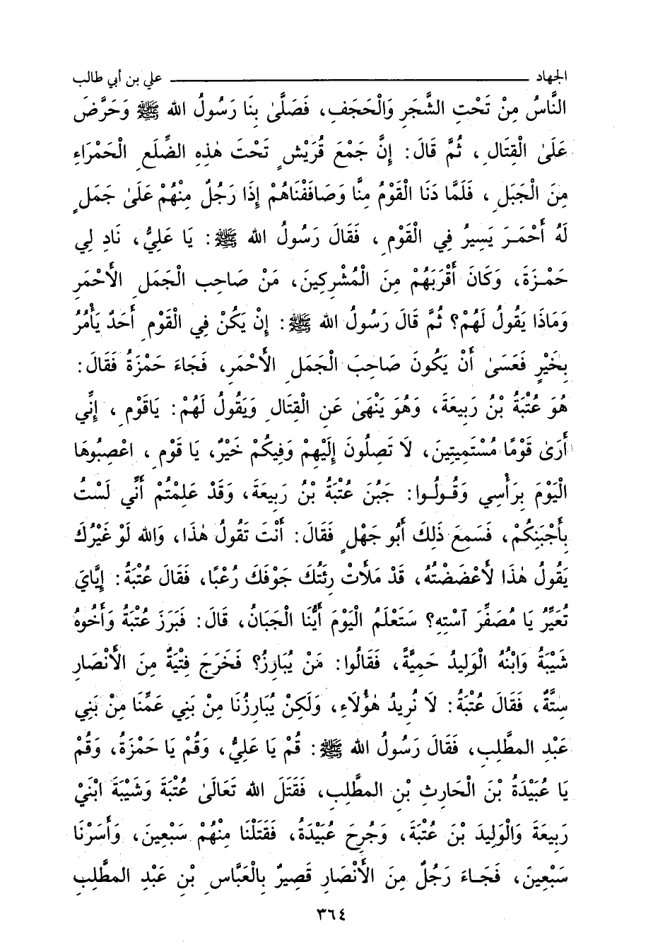 تَحْتِ الشَّجَرِ وَالْحَجَفِ، فَصَلَّى بِنَا رَسُولُ اللهِ صلى الله عليه وسلم، وَحَرَّضَ عَلَى الْقِتَالِ، ثُمَّ قَالَ: إِنَّ جَمْعَ قُرَيْشٍ تَحْتَ هَذِهِ الضِّلَعِ الْحَمْرَاءِ مِنَ الْجَبَلِ، فَلَمَّا دَنَا الْقَوْمُ مِنَّا وَصَافَفْنَاهُمْ، إِذَا رَجُلٌ مِنْهُمْ عَلَى جَمَلٍ لَهُ أَحْمَرَ يَسِيرُ فِي الْقَوْمِ، فَقَالَ رَسُولُ اللهِ صلى الله عليه وسلم: يَا عَلِيُّ، نَادِ لِي حَمْزَةَ، وَكَانَ أَقْرَبَهُمْ مِنَ الْمُشْرِكِينَ، مَنْ صَاحِبُ الْجَمَلِ الأَحْمَرِ، وَمَاذَا يَقُولُ لَهُمْ؟ ثُمَّ قَالَ رَسُولُ اللهِ صلى الله عليه وسلم: إِنْ يَكُنْ فِي الْقَوْمِ أَحَدٌ يَأْمُرُ بِخَيْرٍ، فَعَسَى أَنْ يَكُونَ صَاحِبَ الْجَمَلِ الأَحْمَرِ، فَجَاءَ حَمْزَةُ، فَقال: هُوَ عُتْبَةُ بْنُ رَبِيعَةَ، وَهُوَ يَنْهَى عَنِ الْقِتَالِ، وَيَقُولُ لَهُمْ: يَا قَوْمُ، إِنِّي أَرَى قَوْمًا مُسْتَمِيتِينَ، لَا تَصِلُونَ إِلَيْهِمْ وَفِيكُمْ خَيْرٌ، يَا قَوْمُ، اعْصِبُوهَا الْيَوْمَ بِرَأْسِي، وَقُولُوا جَبُنَ عُتْبَةُ بْنُ رَبِيعَةَ، وَقَدْ عَلِمْتُمْ أَنِّي لَسْتُ بِأَجْبَنِكُمْ، قَالَ: فَسَمِعَ ذَلِكَ أَبُو جَهْلٍ، فَقَالَ: أَنْتَ تَقُولُ هَذَا؟! وَاللهِ، لَوْ غَيْرُكَ يَقُولُ هَذَا لأَعْضَضْتُهُ، قَدْ مَلأَتْ رِئَتُكَ جَوْفَكَ رُعْبًا، فَقَالَ عُتْبَةُ: إِيَّايَ تُعَيِّرُ يَا مُصَفِّرَ اسْتِهِ؟ سَتَعْلَمُ الْيَوْمَ أَيُّنَا الْجَبَانُ، قَالَ: فَبَرَزَ عُتْبَةُ، وَأَخُوهُ شَيْبَةُ، وَابْنُهُ الْوَلِيدُ حَمِيَّةً، فَقَالُوا: مَنْ يُبَارِزُ؟ فَخَرَجَ فِتْيَةٌ مِنَ الأَنْصَارِ سِتَّةٌ، فَقال عُتْبَةُ: لَا نُرِيدُ هَؤُلَاءِ، وَلَكِنْ يُبَارِزُنَا مِنْ بَنِي عَمِّنَا مِنْ بَنِي عَبْدِ الْمُطَّلِبِ، فَقَالَ رَسُولُ اللهِ صلى الله عليه وسلم: قُمْ يَا
