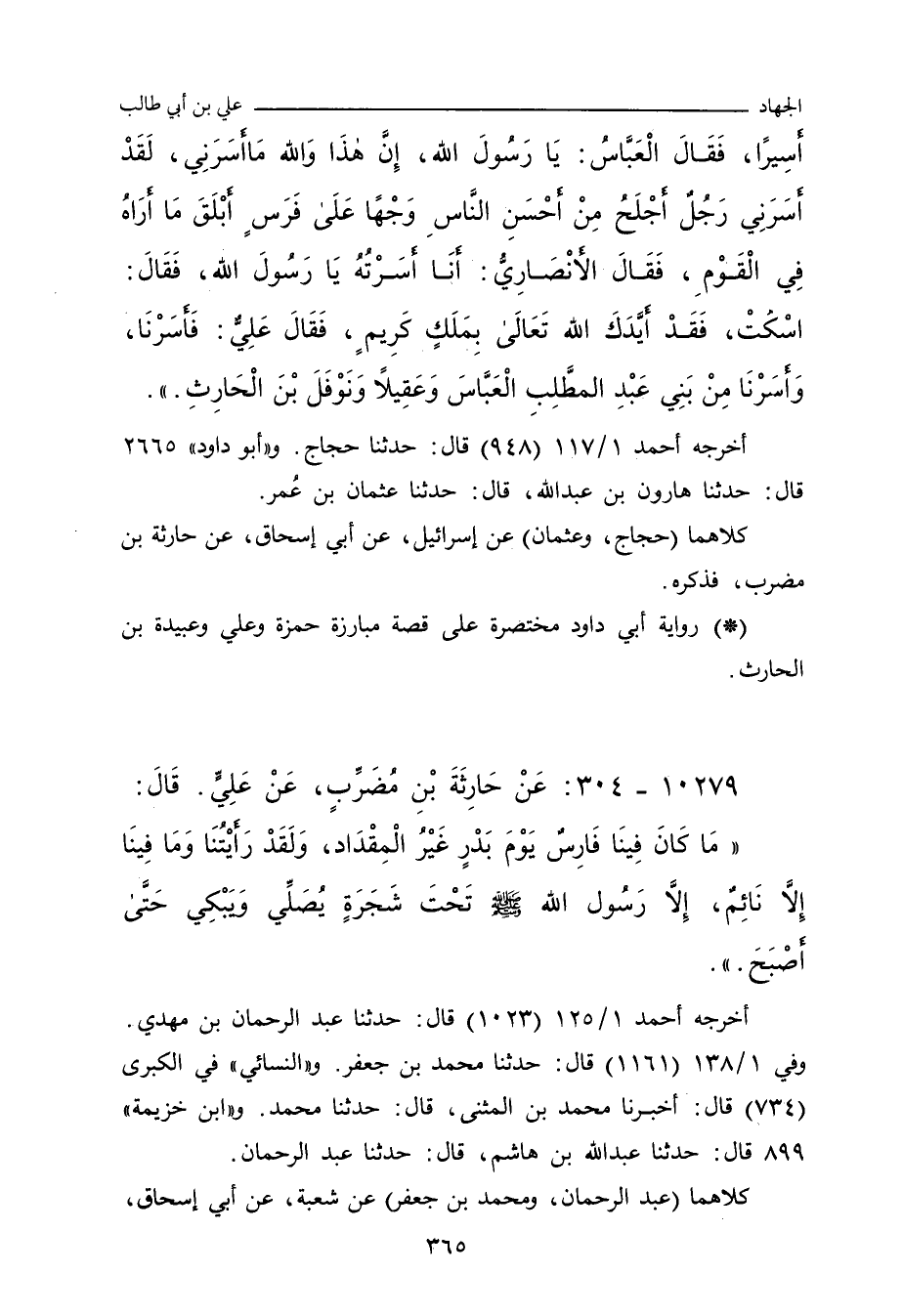 مَا كَانَ فِينَا فَارِسٌ يَوْمَ بَدْرٍ غَيْرُ الْمِقْدَادِ، وَلَقَدْ رَأَيْتُنَا وَمَا فِينَا إِلَاّ نَائِمٌ، إِلَاّ رَسُولَ اللهِ صلى الله عليه وسلم، تَحْتَ شَجَرَةٍ يُصَلِّي وَيَبْكِي، حَتَّى أَصْبَحَ.