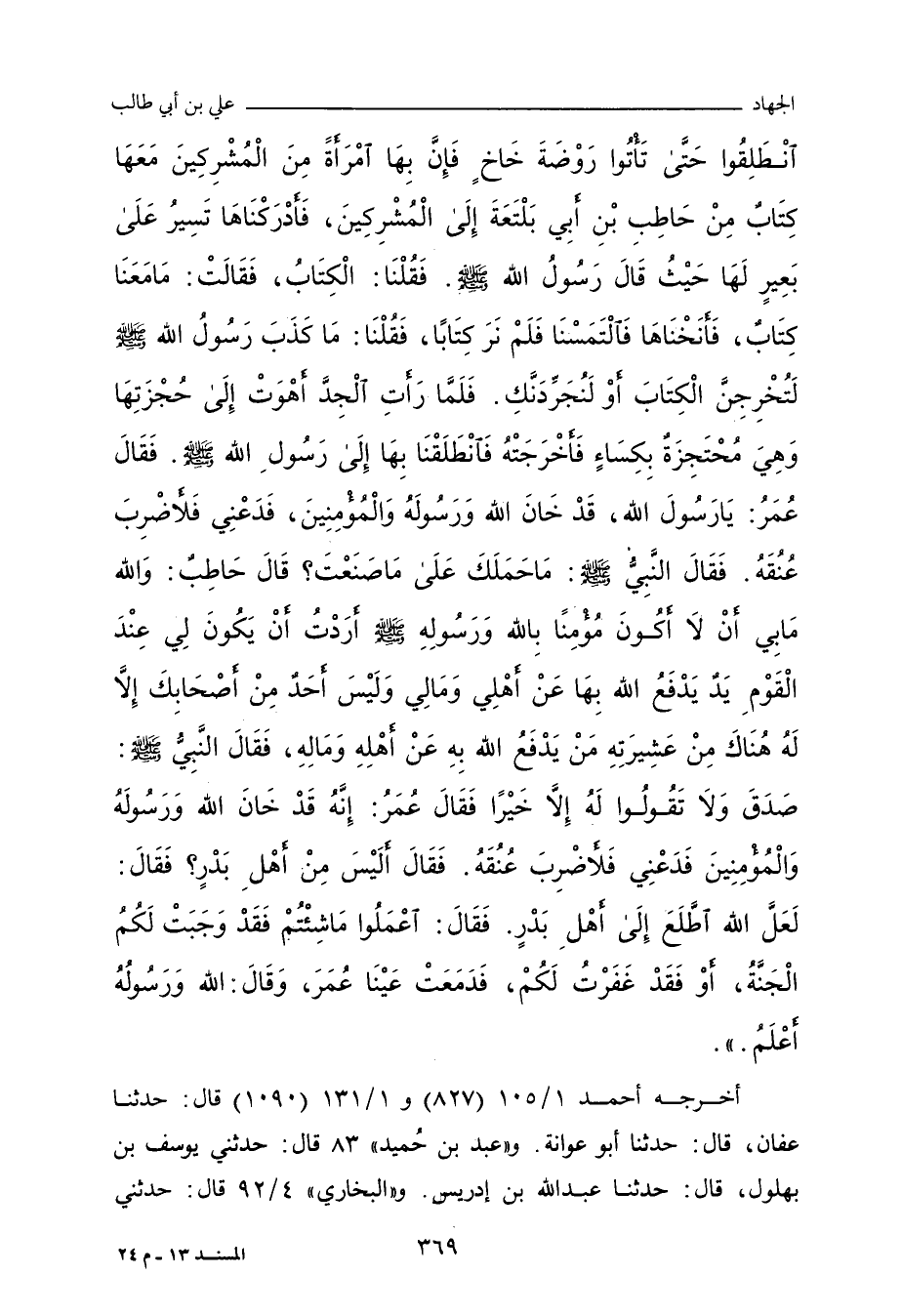 - وفي رواية: عَنْ أَبِي عَبْدِ الرَّحْمَانِ، وَكَانَ عُثْمَانِيًّا، فَقَالَ لابْنِ عَطِيَّةَ، وَكَانَ عَلَوِيًّا: إِنِّي لأَعْلَمُ مَا الَّذِي جَرَّأَ صَاحِبَكَ عَلَى الدِّمَاءِ، سَمِعْتُهُ يَقُولُ: بَعَثَنِي النَّبِيُّ صلى الله عليه وسلم، وَالزُّبَيْرَ، فَقَالَ: ائْتُوا رَوْضَةَ كَذَا، وَتَجِدُونَ بِهَا امْرَأَةً، أَعْطَاهَا حَاطِبٌ كِتَابًا، فَأَتَيْنَا الرَّوْضَةَ، فَقُلْنَا: الْكِتَابَ، قَالَتْ: لَمْ يُعْطِنِي، فَقُلْنَا: لَتُخْرِجِنَّ، أَوْ لأُجَرِّدَنَّكِ، فَأَخْرَجَتْ مِنْ حُجْزَتِهَا، فَأَرْسَلَ إِلَى حَاطِبٍ، فَقَالَ: لَا تَعْجَلْ، وَاللهِ، مَا كَفَرْتُ، وَلَا ازْدَدْتُ لِلإِسْلَامِ إِلَاّ حُبًّا، وَلَمْ يَكُنْ أَحَدٌ مِنْ أَصْحَابِكَ، إِلَاّ وَلَهُ بِمَكَّةَ مَنْ يَدْفَعُ اللَّهُ بِهِ عَنْ أَهْلِهِ وَمَالِهِ، وَلَمْ يَكُنْ لِي أَحَدٌ، فَأَحْبَبْتُ أَنْ أَتَّخِذَ عِنْدَهُمْ يَدًا، فَصَدَّقَهُ النَّبِيُّ صلى الله عليه وسلم، قَالَ عُمَرُ: دَعْنِي أَضْرِبْ عُنُقَهُ، فَإِنَّهُ قَدْ نَافَقَ، فَقَالَ: مَا يُدْرِيكَ، لَعَلَّ اللهَ اطَّلَعَ عَلَى أَهْلِ بَدْرٍ، فَقَالَ: اعْمَلُوا مَا شِئْتُمْ.