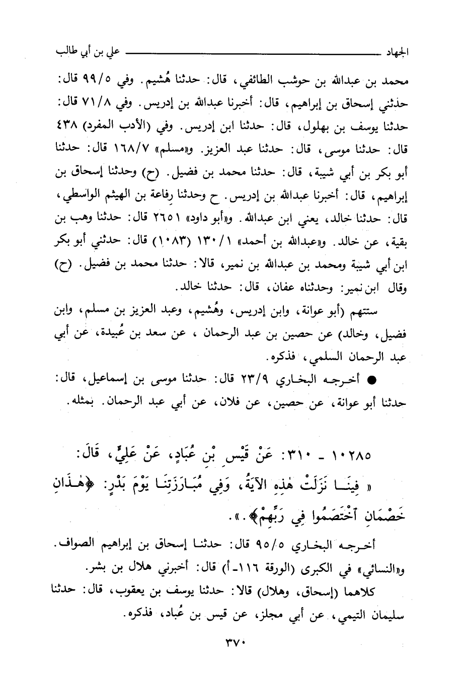 مُحَمد بن عَبْد الله بن حَوْشَب الطَّائِفِي، حدَّثنا هُشَيْم. وفي ٥/ ٩٩ (٣٩٨٣) قال: حدَّثني إِسْحاق بن إبراهيم، أَخْبَرنا عَبْد الله ابن إِدْرِيس. وفي ٨/ ٧١ (٦٢٥٩) قال: حدَّثنا يُوسُف بن بُهْلُول، حدَّثنا ابن إِدْرِيس. وفي "الأدب المفرد" ٤٣٨ قال: حدَّثنا مُوسَى، قال: حدَّثنا عَبْد العَزِيز. و"مسلم" ٧/ ١٦٨ (٦٤٨٦) قال: حدَّثنا أبو بَكْر ابن أَبي شَيْبَة، حدَّثنا مُحَمد بن فُضَيْل (ح) وحدَّثنا إِسْحاق بن إبراهيم، أَخْبَرنا عَبْد الله بن إِدْرِيس (ح) وحدَّثنا رِفاعة بن الهَيْثَم الواسطي، حدَّثنا خالد، يعني ابن عَبْد الله. و"أبو داود" ٢٦٥١ قال: حدَّثنا وَهْب بن بَقِيَّة , عن خالد. و (عبد الله بن أحمد) ١/ ١٣٠ (١٠٨٣) قال: حدَّثني أبو بَكْر بن أَبي شَيْبَة، ومُحَمد بن عَبْد الله بن نُمَيْر، قالا: حدَّثنا مُحَمد بن فُضَيْل (ح) وقال ابن نُمَيْر: وحدَّثناه عَفَّان، حدَّثنا خالد.