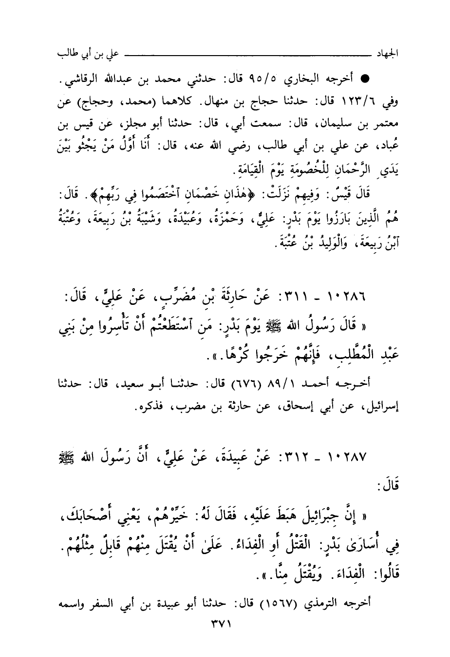 كلاهما (مُحَمد، وحَجَّاج) عن مُعْتَمِر بن سُلَيْمان، قال: سَمِعْتُ أَبي، قال: حدَّثنا أبو مِجْلَز , عَنْ قَيْسِ بْنِ عُبَادٍ، عَنْ عَلِيِّ بْنِ أَبِي طَالِبٍ، رَضِيَ اللَّهُ عَنْهُ، قَالَ: أَنَا أَوَّلُ مَنْ يَجْثُو بَيْنَ يَدَيِ الرَّحْمَانِ لِلْخُصُومَةِ، يَوْمَ الْقِيَامَةِ.