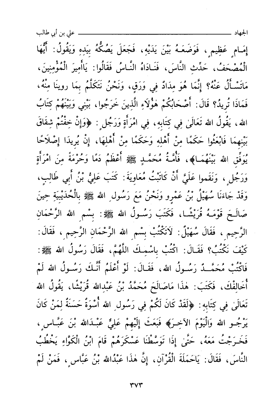 اللَّهُ تَعَالَى فِي كِتَابِهِ، فِي امْرَأَةٍ وَرَجُلٍ: "وَإِنْ خِفْتُمْ شِقَاقَ بَيْنِهِمَا فَابْعَثُوا حَكَمًا مِنْ أَهْلِهِ وَحَكَمًا مِنْ أَهْلِهَا إِنْ يُرِيدَا إِصْلَاحًا يُوَفِّقِ اللَّهُ بَيْنَهُمَا) فَأُمَّةُ مُحَمَّدٍ صلى الله عليه وسلم أَعْظَمُ دَمًا وَحُرْمَةً مِنِ امْرَأَةٍ وَرَجُلٍ، وَنَقَمُوا عَلَيَّ أَنْ كَاتَبْتُ مُعَاوِيَةَ، كَتَبَ عَلِيُّ بْنُ أَبي طَالِبٍ،