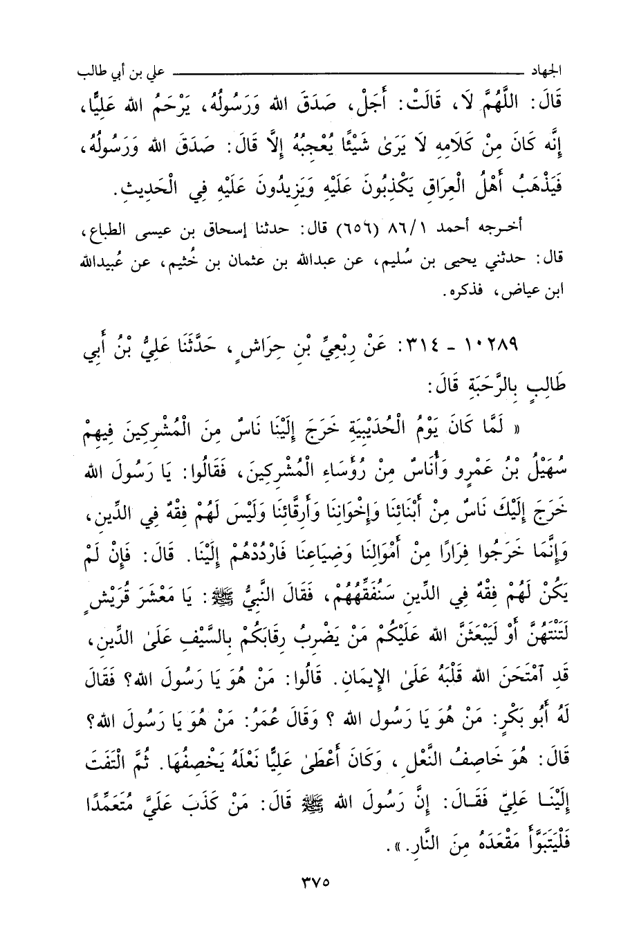 لَمَّا كَانَ يَوْمُ الْحُدَيْبِيَةِ، خَرَجَ إِلَيْنَا نَاسٌ مِنَ الْمُشْرِكِينَ، فِيهِمْ سُهَيْلُ بْنُ عَمْرٍو، وَأُنَاسٌ مِنْ رُؤَسَاءِ الْمُشْرِكِينَ، فَقَالُوا: يَا رَسُولَ اللهِ، خَرَجَ إِلَيْكَ نَاسٌ مِنْ أَبْنَائِنَا، وَإِخْوَانِنَا، وَأَرِقَّائِنَا، وَلَيْسَ لَهُمْ فِقْهٌ فِي الدِّينِ، وَِإِنَّمَا خَرَجُوا فِرَارًا مِنْ أَمْوَالِنَا وَضِيَاعِنَا، فَارْدُدْهُمْ إِلَيْنَا، قَالَ: فَإِنْ لَمْ يَكُنْ لَهُمْ فِقْهٌ فِي الدِّينِ سَنُفَقِّهُهُمْ، فَقَالَ النَّبِيُّ صلى الله عليه وسلم: يَا مَعْشَرَ قُرَيْشٍ، لَتَنْتَهُنَّ، أَوْ لَيَبْعَثَنَّ اللَّهُ عَلَيْكُمْ مَنْ يَضْرِبُ رِقَابَكُمْ بِالسَّيْفِ عَلَى الدِّينِ، قَدِ امْتَحَنَ اللَّهُ قَلْبَهُ عَلَى الإِيمَانِ، قَالُوا: مَنْ هُوَ، يَا رَسُولَ اللهِ؟ فَقَالَ لَهُ أَبُو بَكْرٍ: مَنْ هُوَ، يَا رَسُولَ اللهِ؟ وَقَالَ عُمَرُ: مَنْ هُوَ، يَا رَسُولَ اللهِ؟ قَالَ: هُوَ خَاصِفُ النَّعْلِ، وَكَانَ أَعْطَى عَلِيًّا نَعْلَهُ يَخْصِفُهَا، ثُمَّ الْتَفَتَ إِلَيْنَا عَلِيٌّ، فَقَالَ: إِنَّ رَسُولَ اللهِ صلى الله عليه وسلم قَالَ: مَنْ كَذَبَ عَلَيَّ مُتَعَمِّدًا، فَلْيَتَبَوَّأْ مَقْعَدَهُ مِنَ النَّارِ.